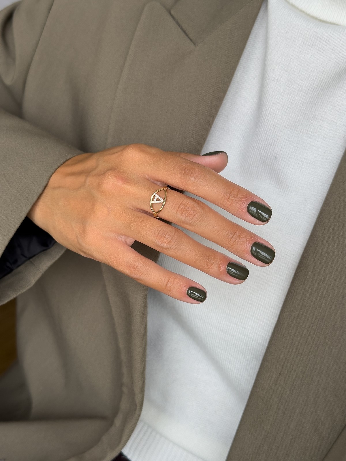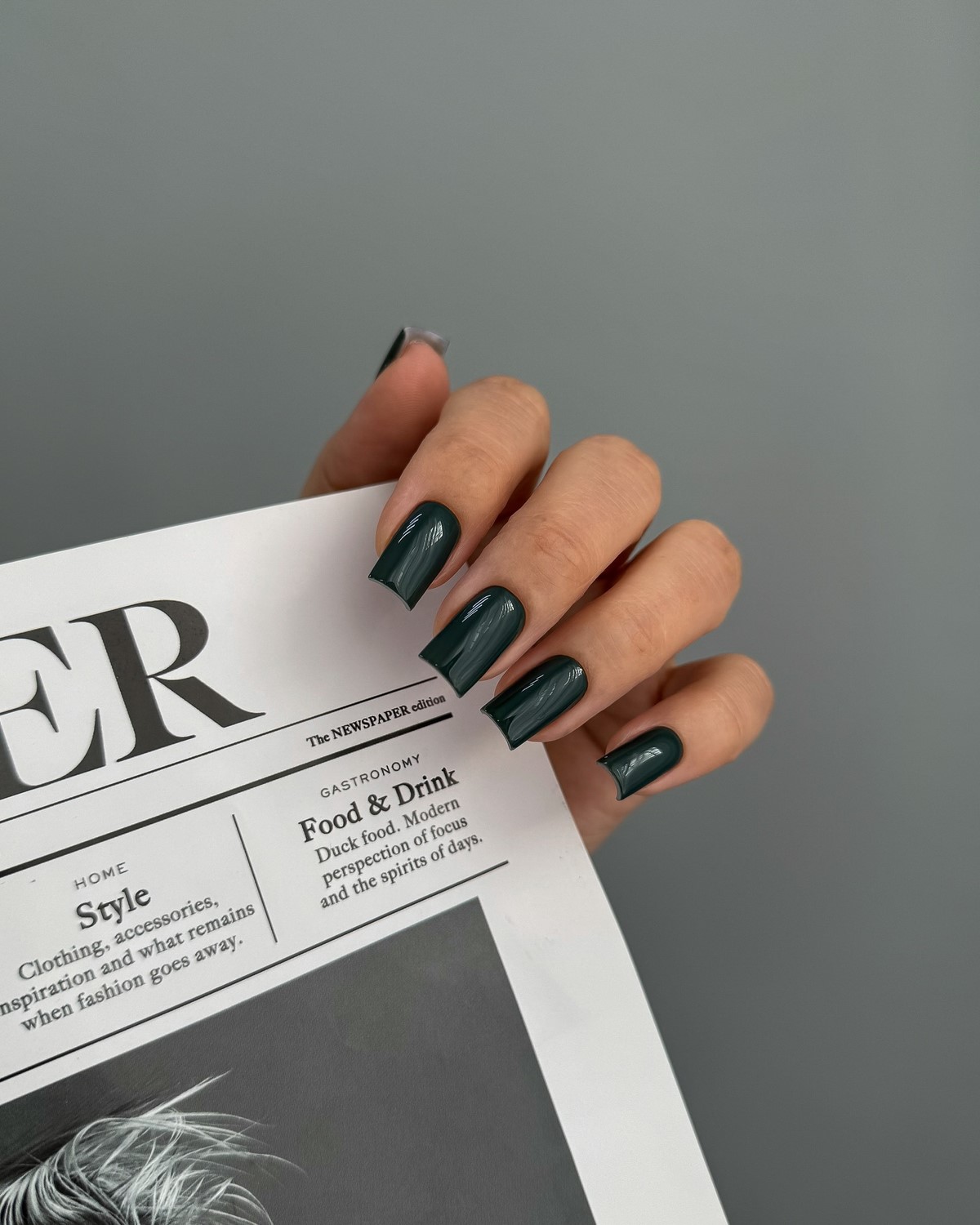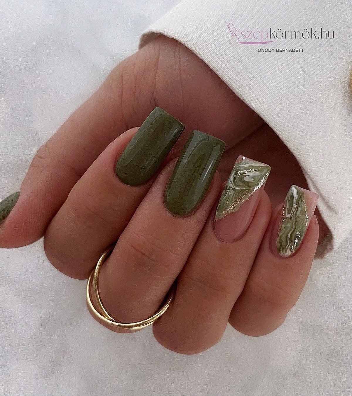 Зелений в жовтні 2025 року грає різними гранями: від ніжного фісташкового до насиченого смарагдового. Цей відтінок асоціюється з гармонією і природою. Зелений манікюр можна зробити однотонним або з додаванням металевих елементів. Відмінно поєднується із золотими акцентами, які додають розкоші.