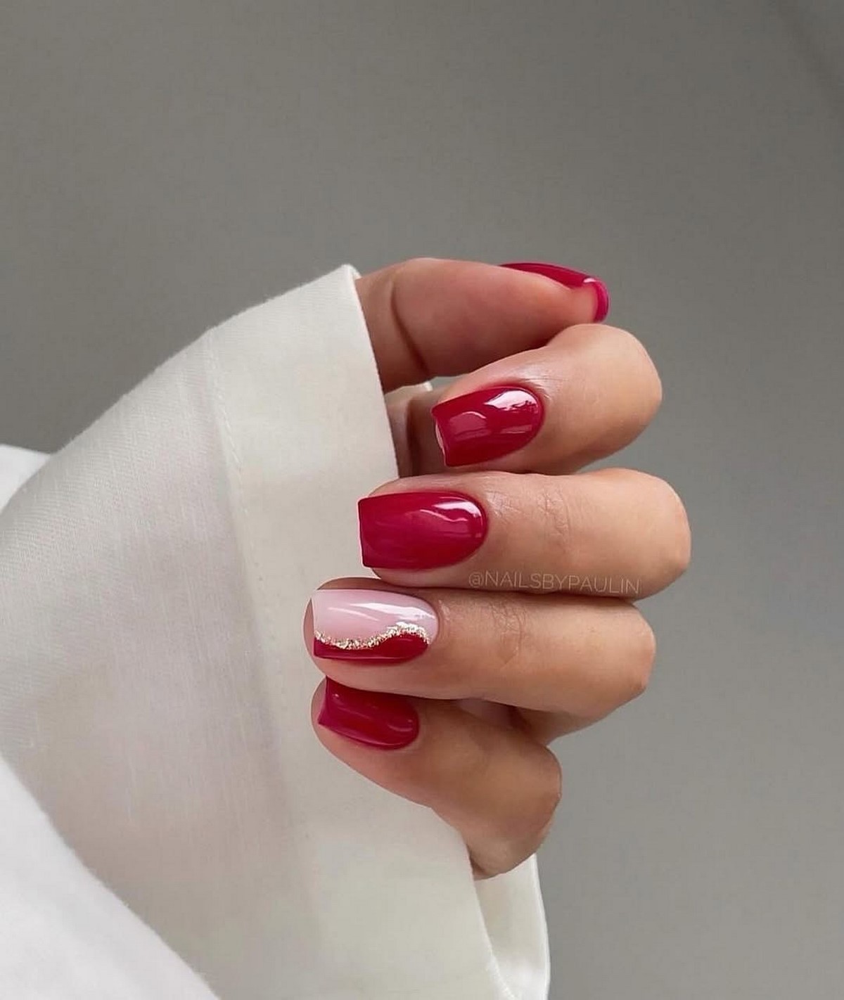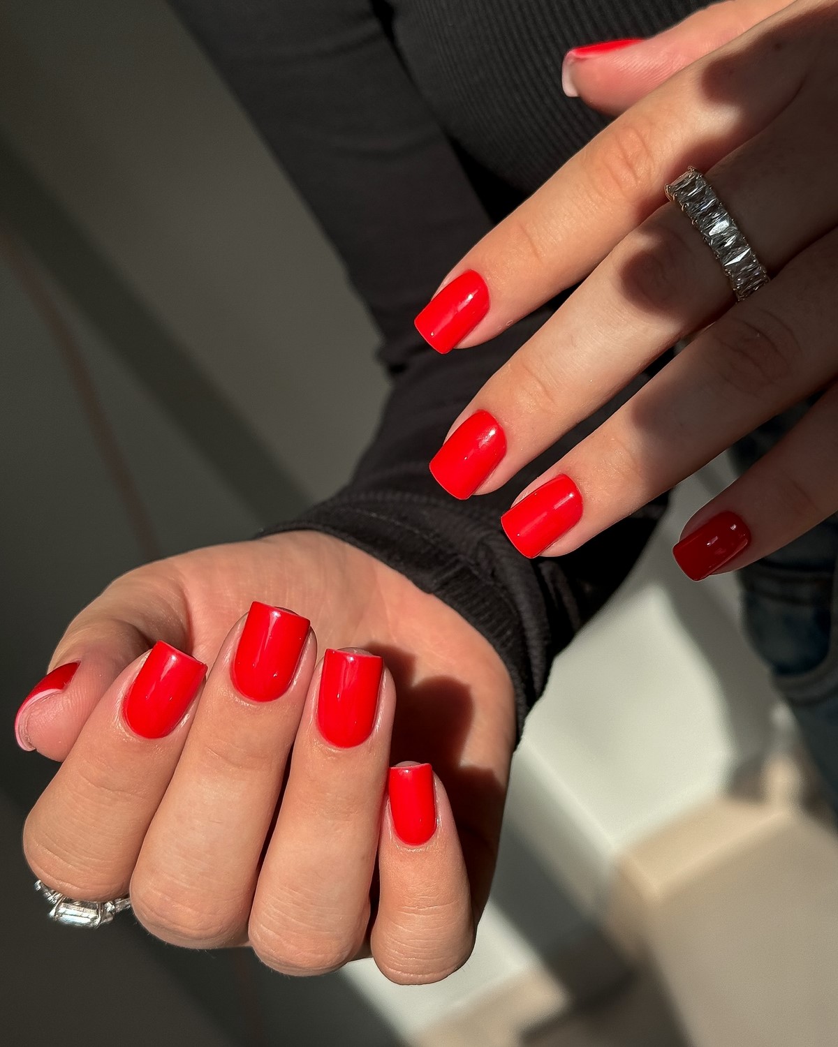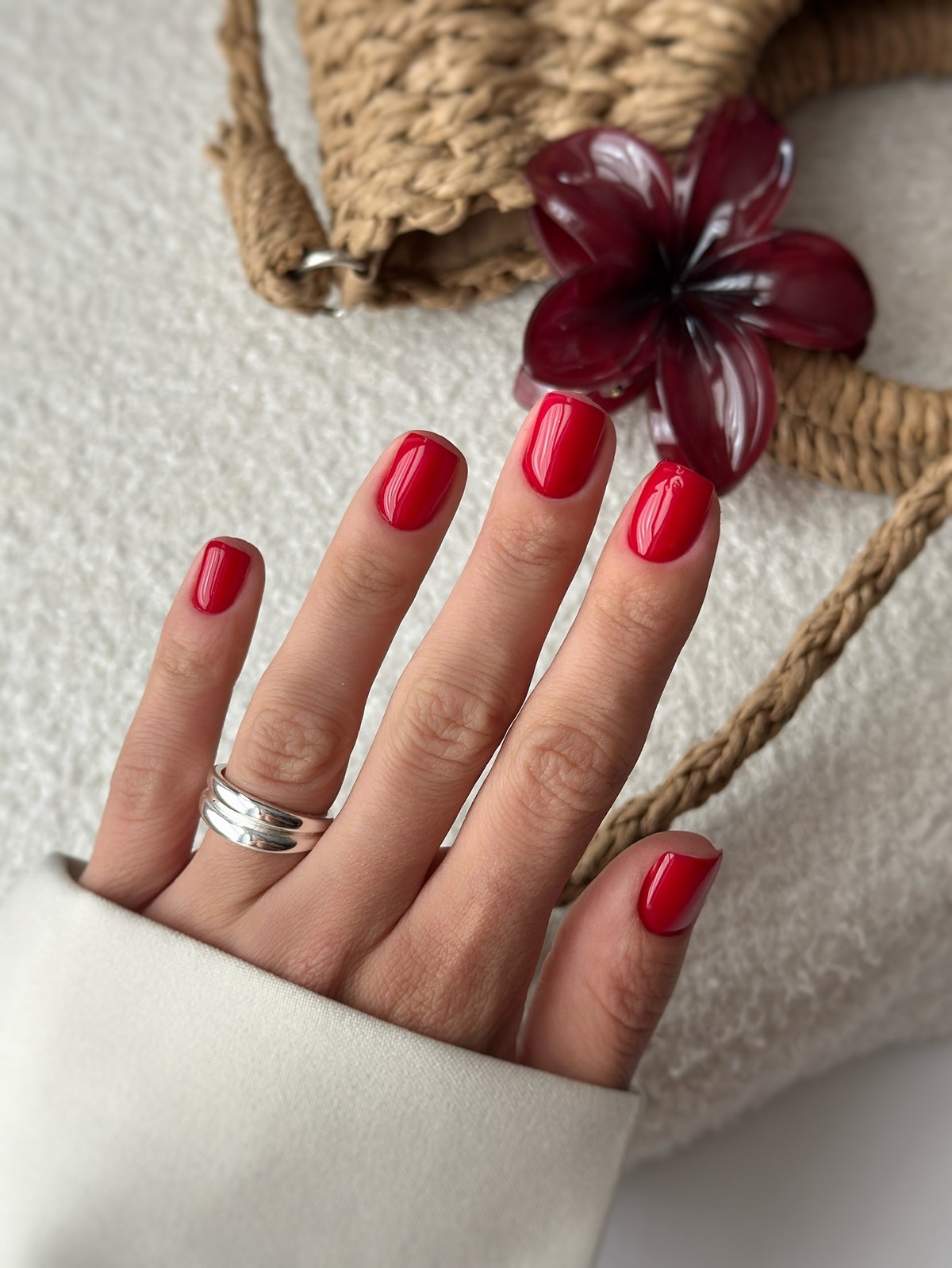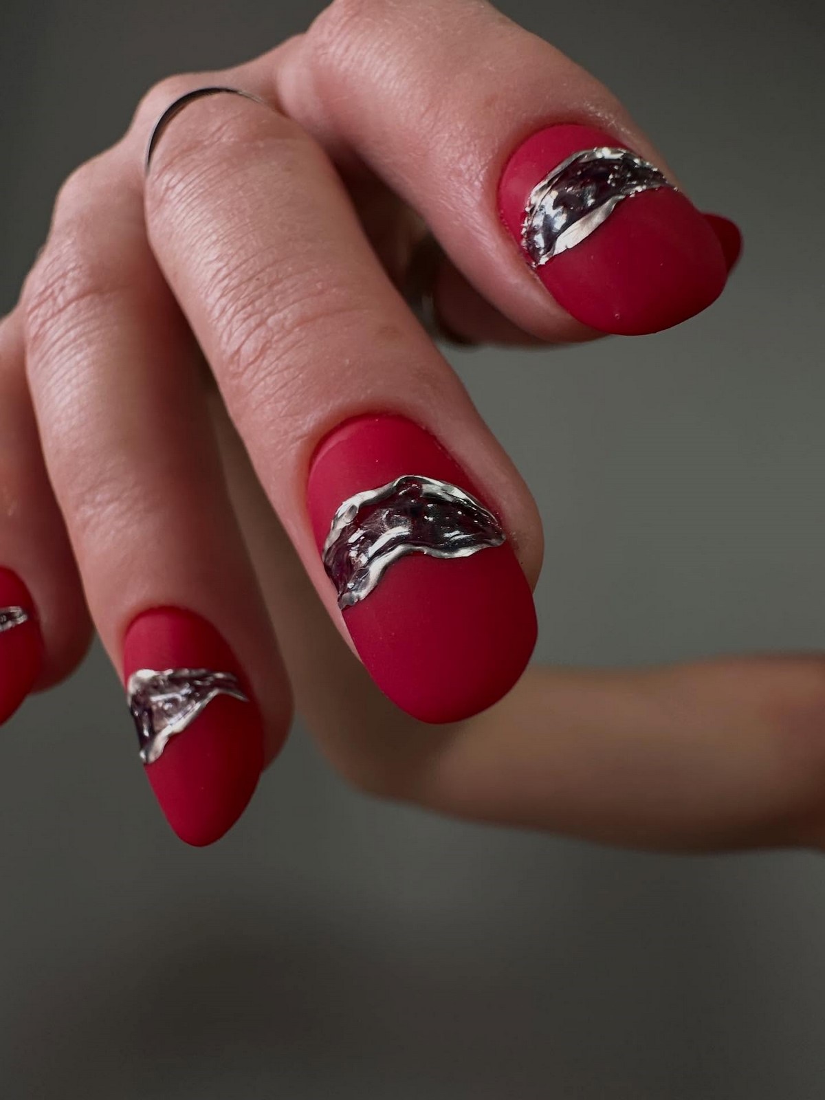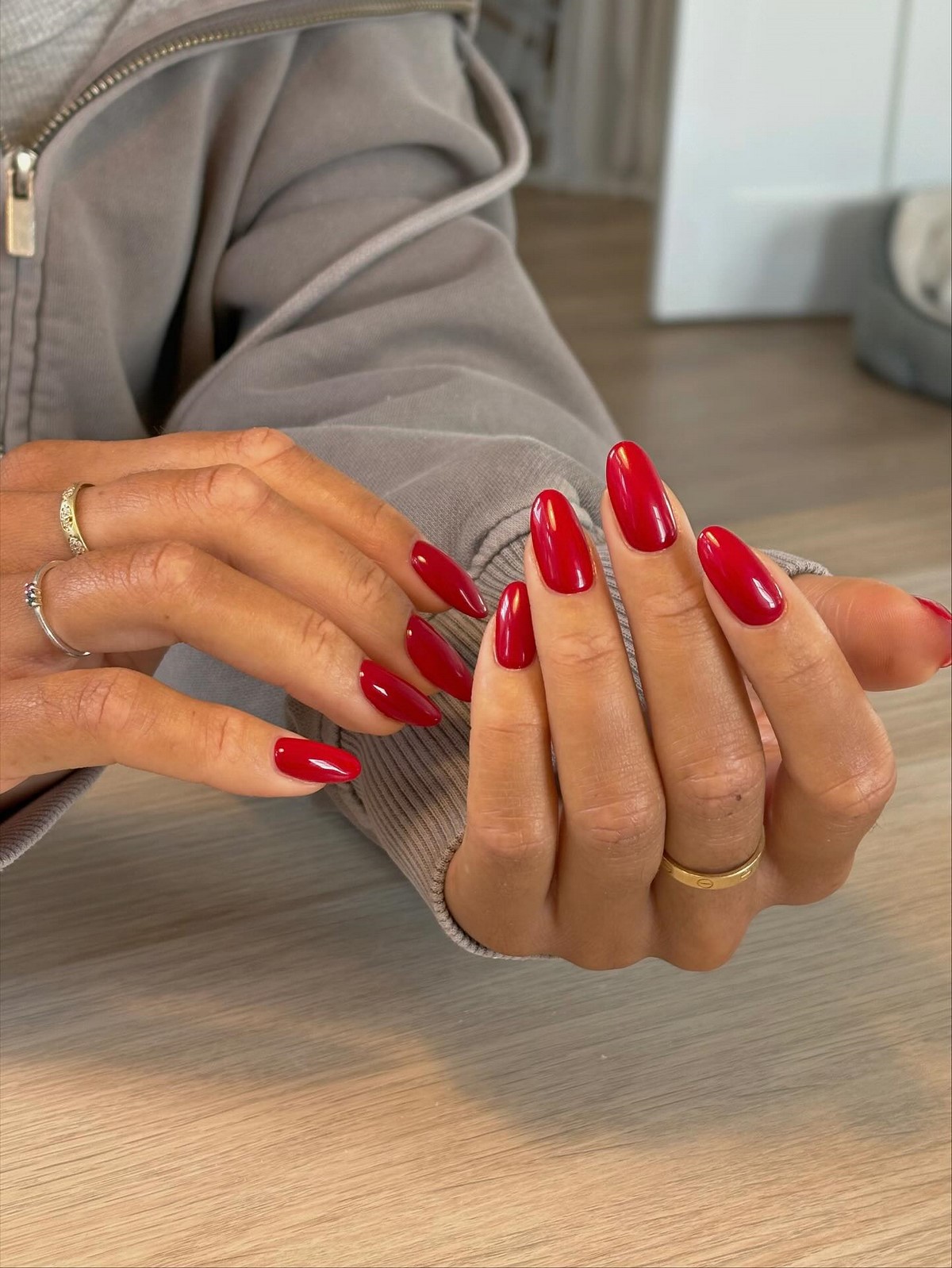 Червоний — символ пристрасті та впевненості. У жовтні 2025 року він представлений у широкому спектрі: від яскравого червоного до глибокого винного. Такий манікюр підійде як для повсякденного образу, так і для особливих випадків. Червоний добре виглядає як в однотонному виконанні, так і в дизайнах з акцентом — наприклад, із золотим декором або мінімалістичним малюнком.