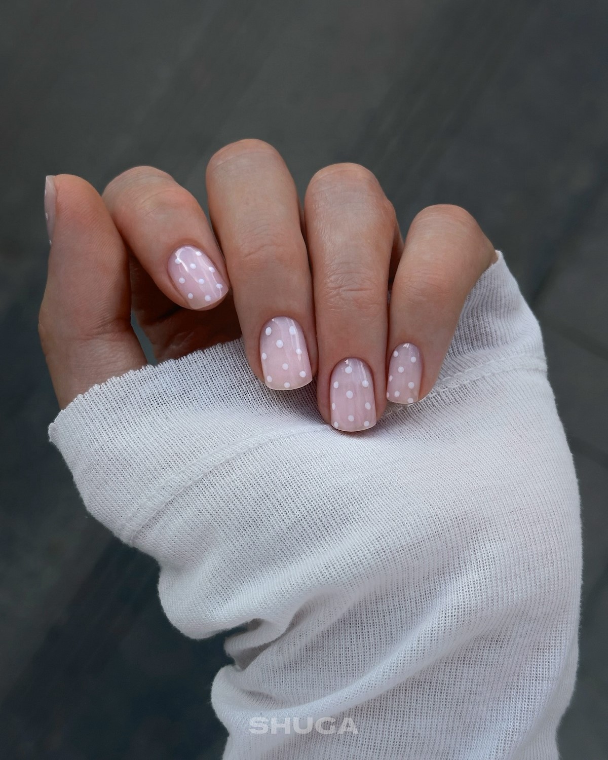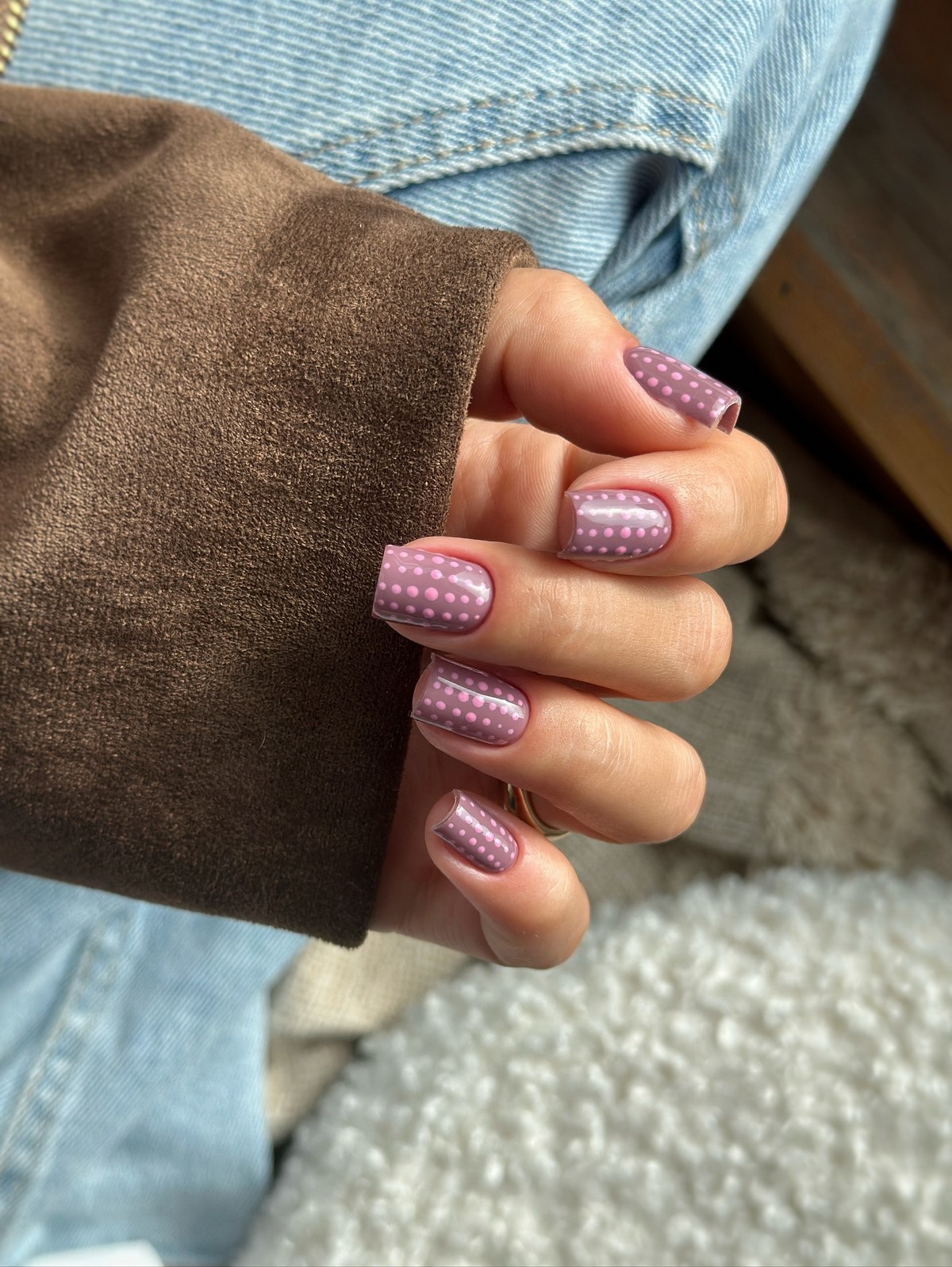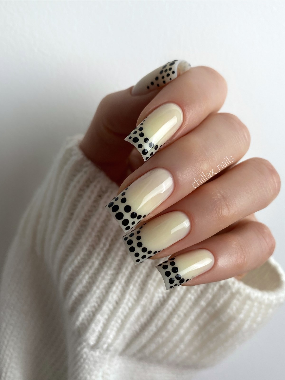 Гороховий принт — грайливе і стильне рішення. Восени 2025 року він виконується в стриманих відтінках: чорному, сірому, білому. Такий дизайн надає нігтям графічності та оригінальності. Polka Dots можна використовувати як акцент на одному-двох нігтях або зробити повноцінний дизайн.