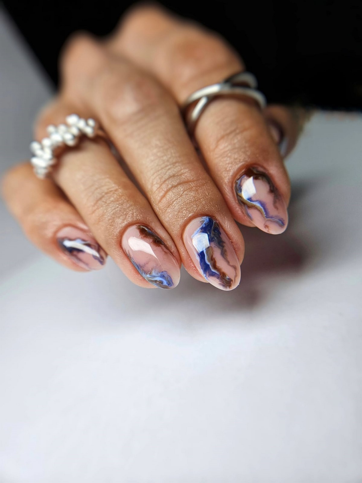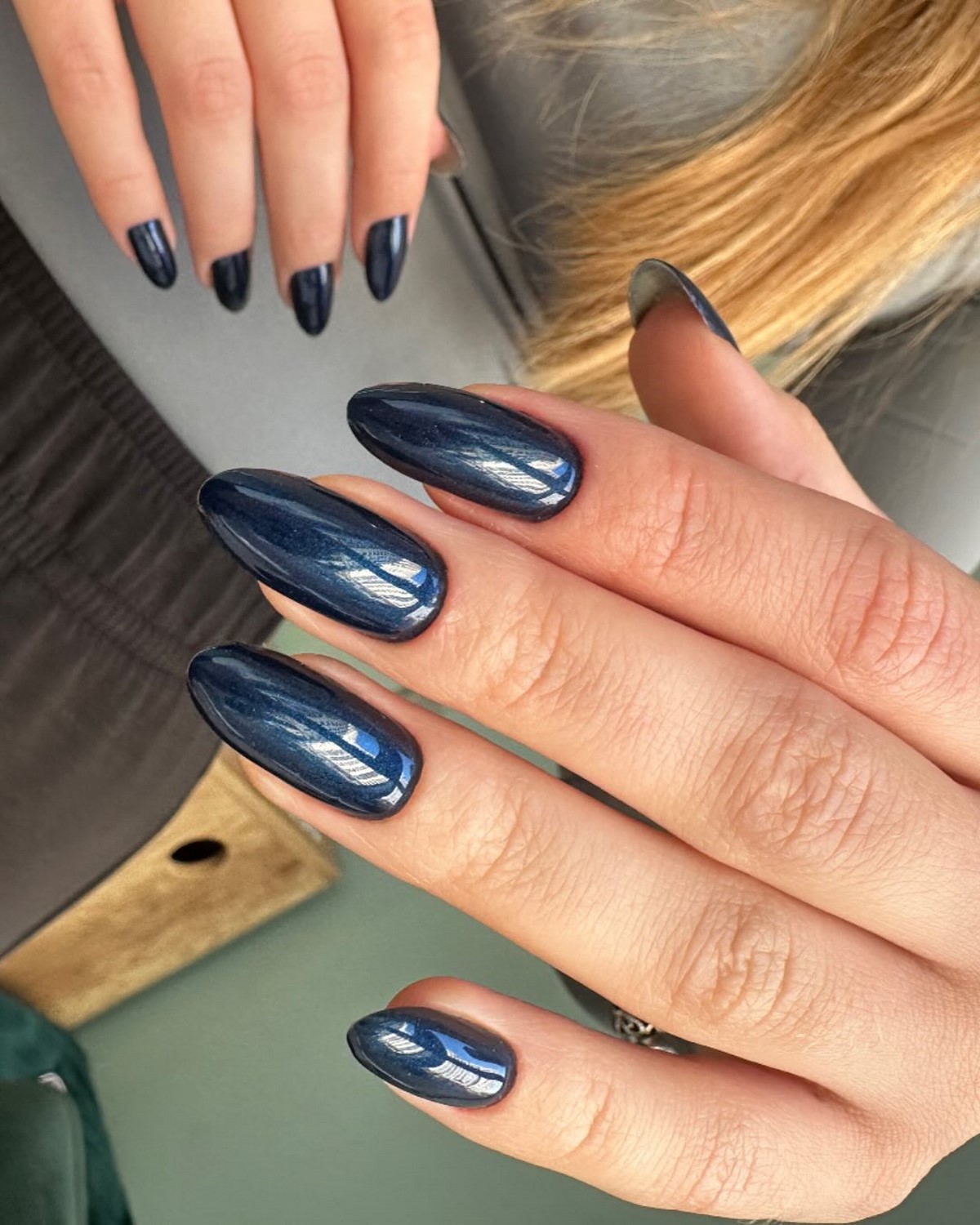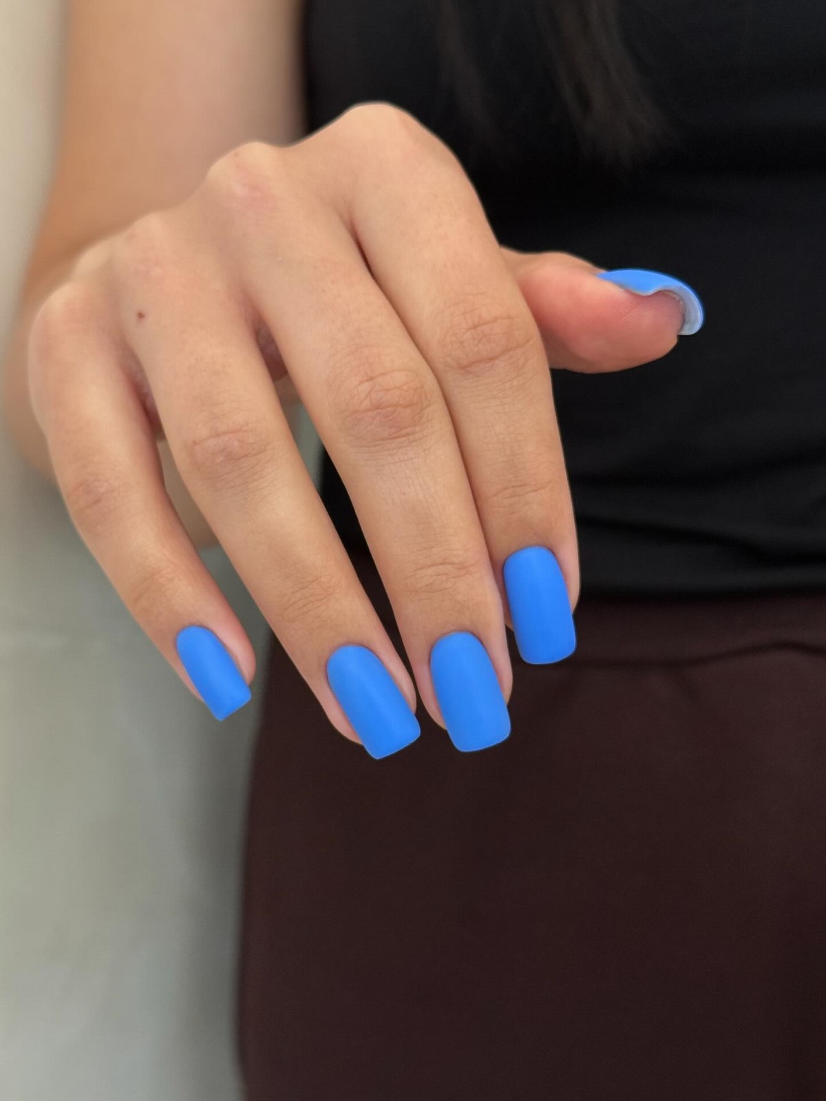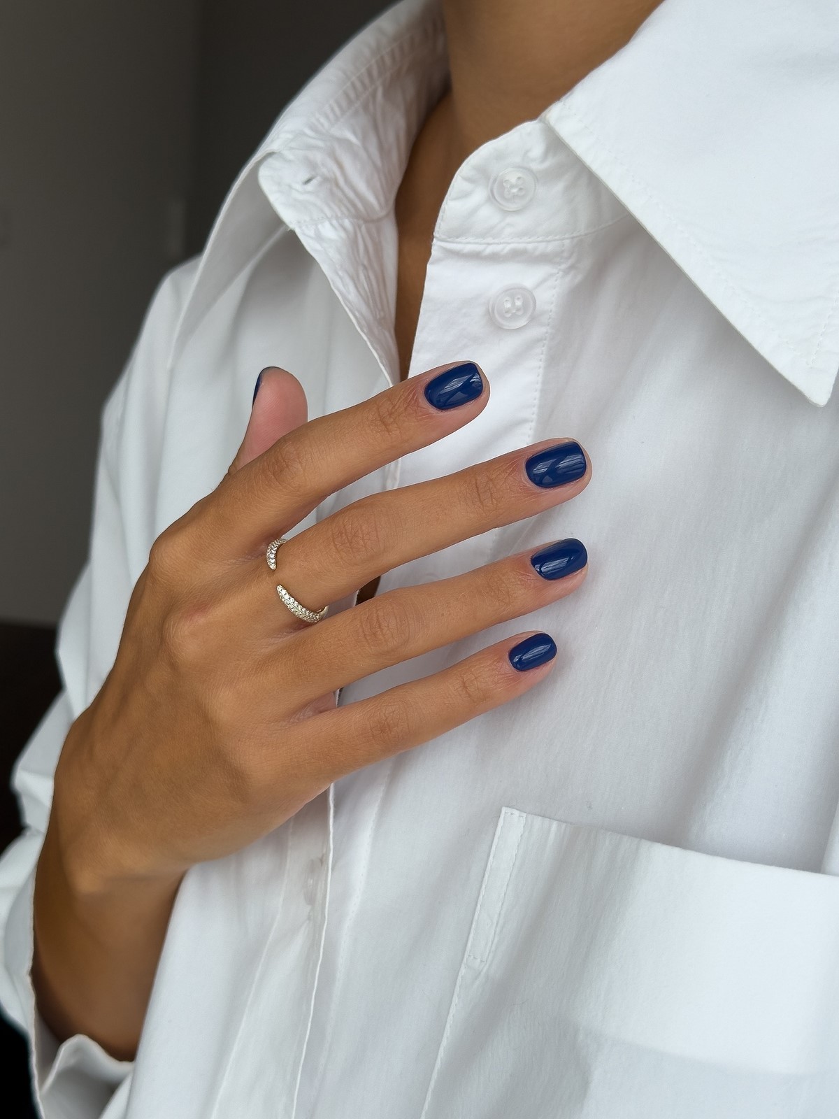 Синій в жовтні асоціюється з глибиною і прохолодою. Від небесного до темно-сапфірового — цей колір виглядає ефектно і сучасно. Особливо актуальні глянцеві покриття і поєднання з білим або срібним. Такий манікюр підкреслить витонченість і загадковість образу.