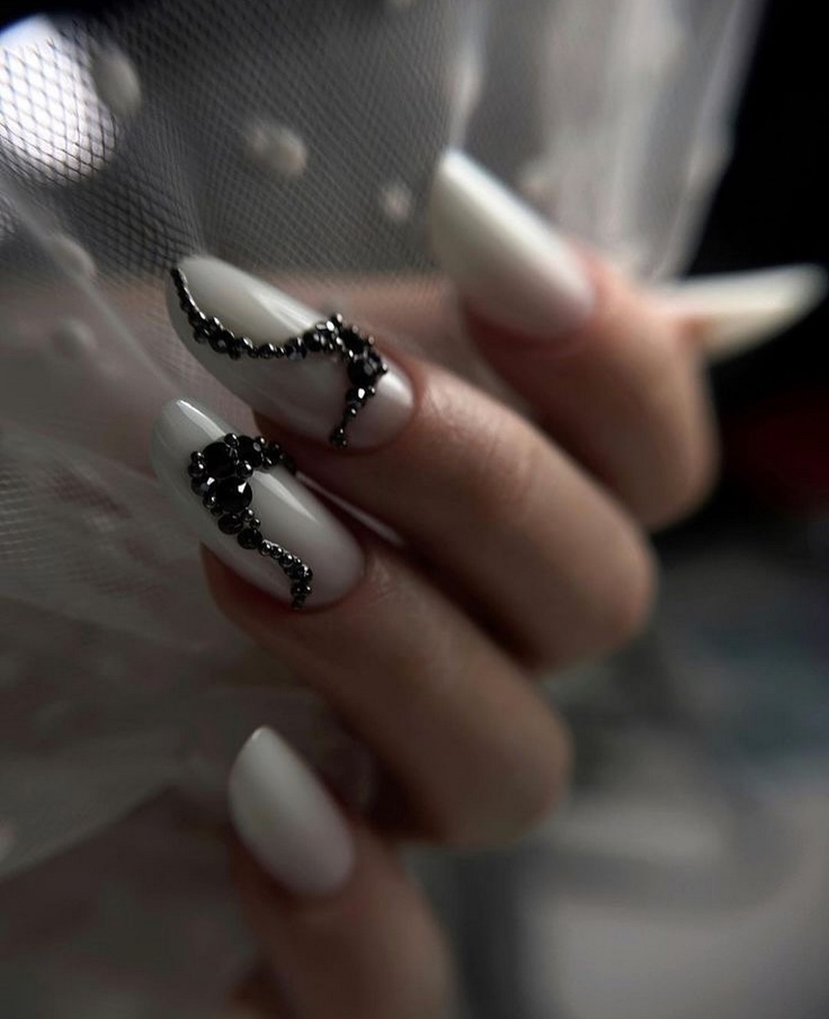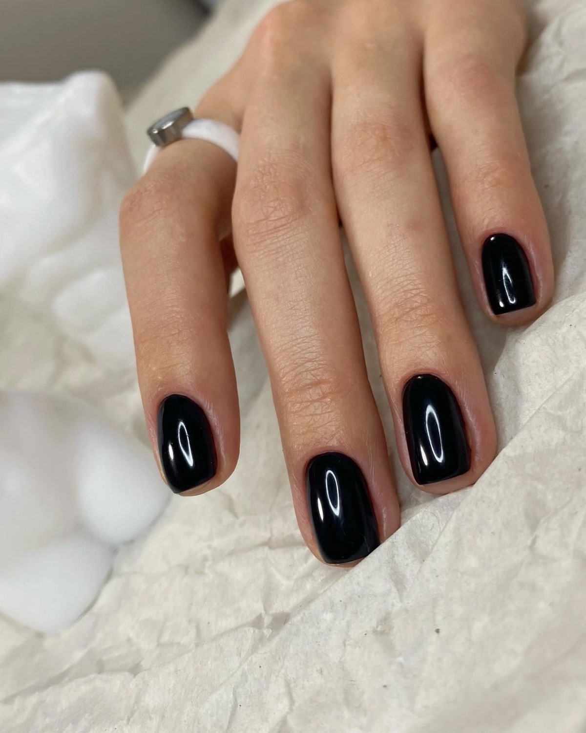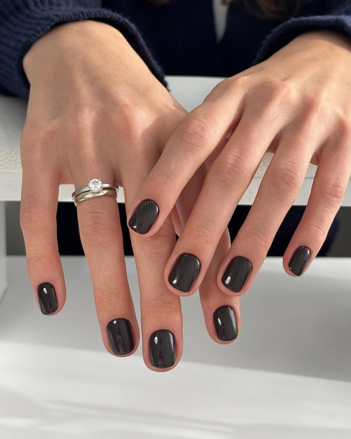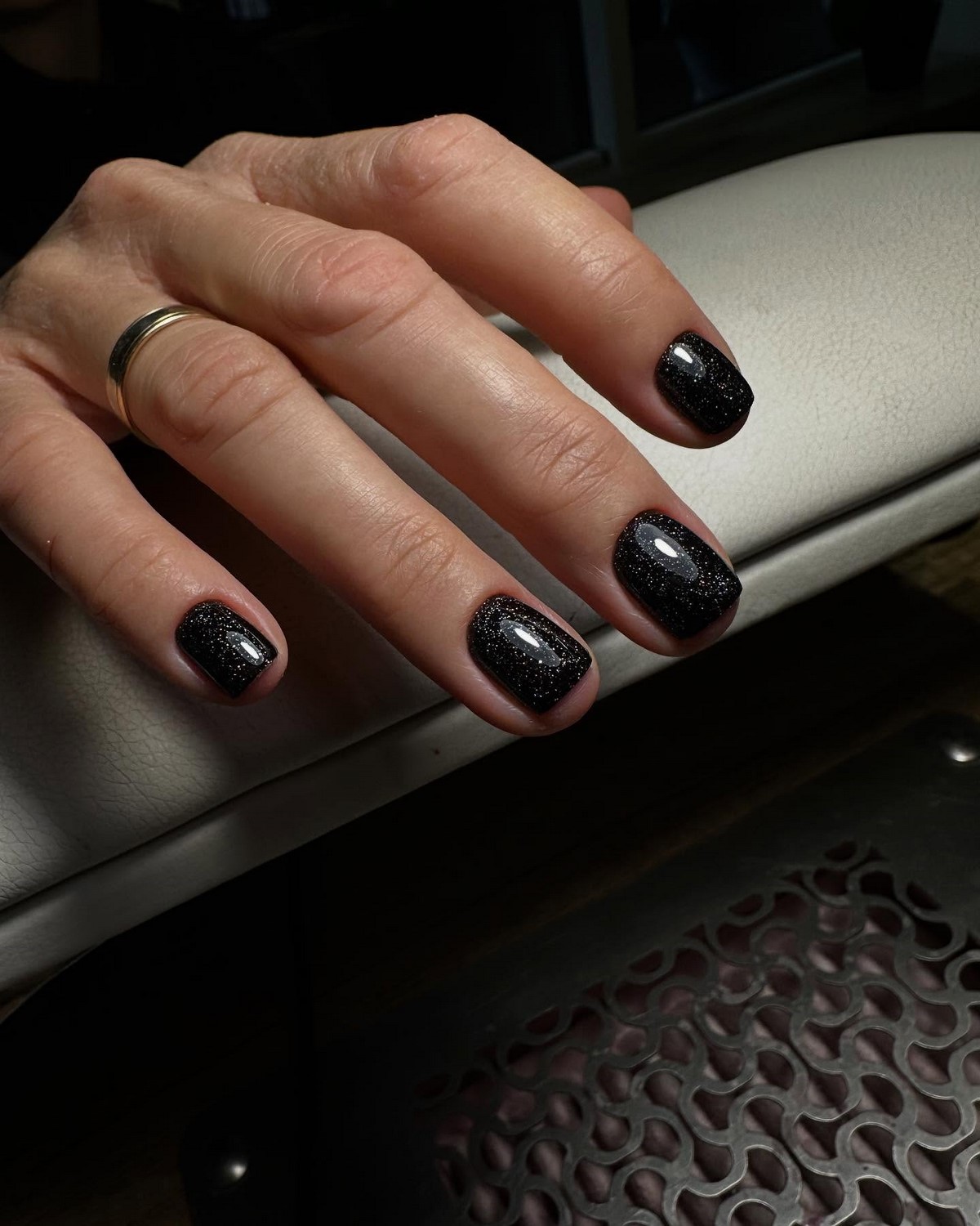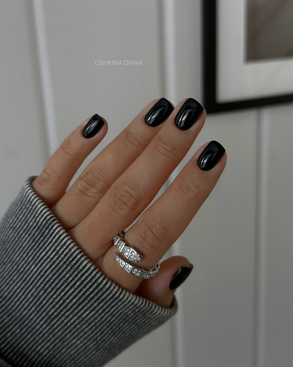 Чорний — сміливе рішення, яке в жовтні стає особливо актуальним. У монохромному варіанті він виглядає стильно і мінімалістично, а в поєднанні з блискітками або текстурними вставками — розкішно і яскраво. Чорний манікюр підходить для любительок авангарду і готичної естетики.