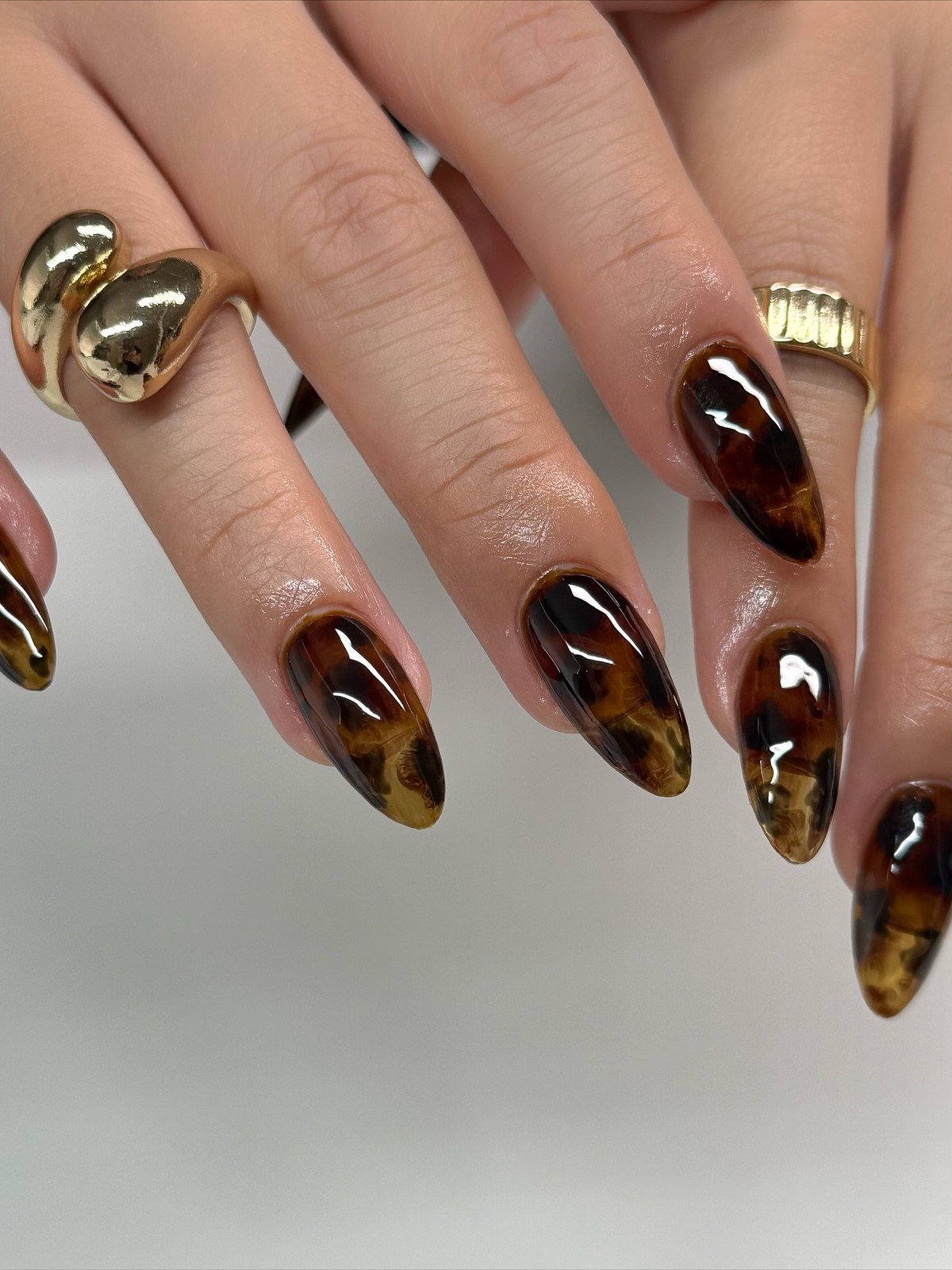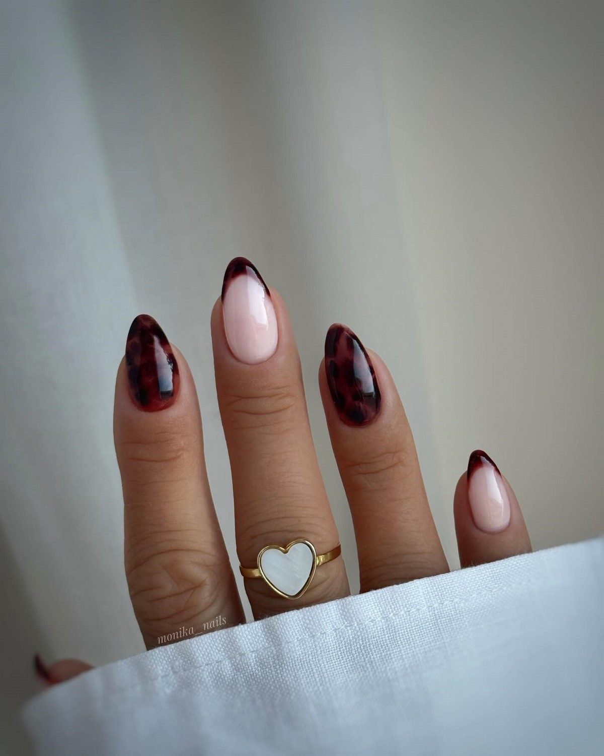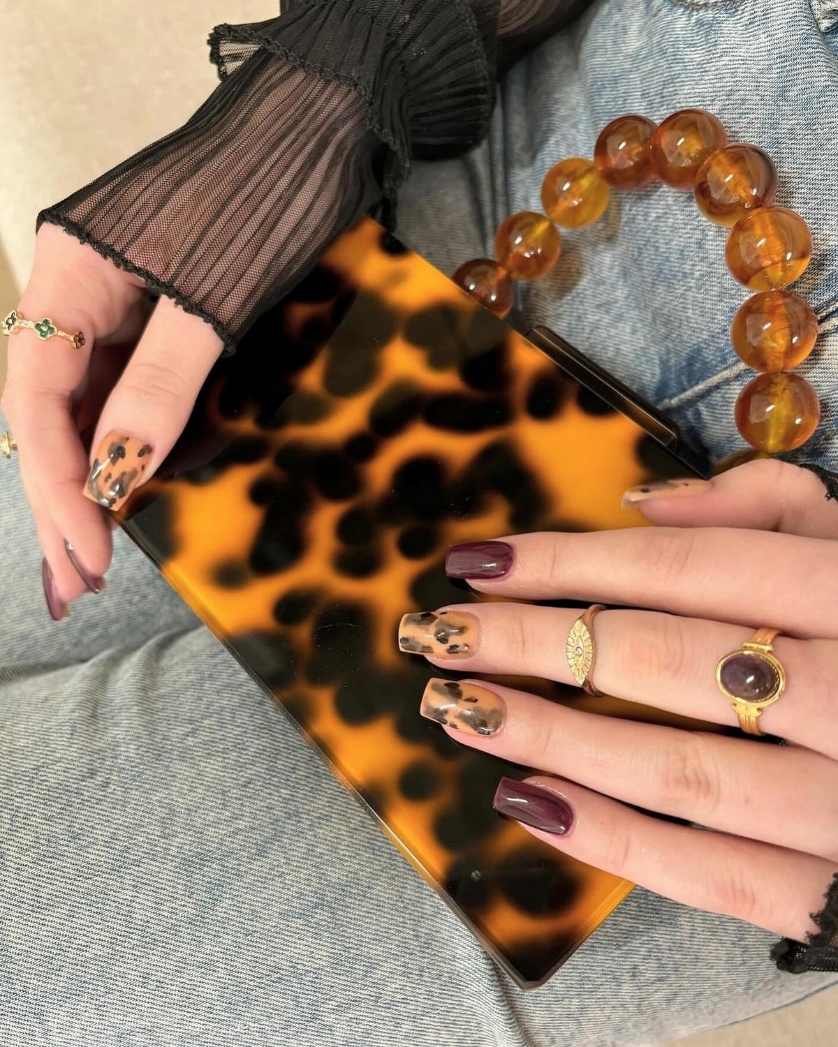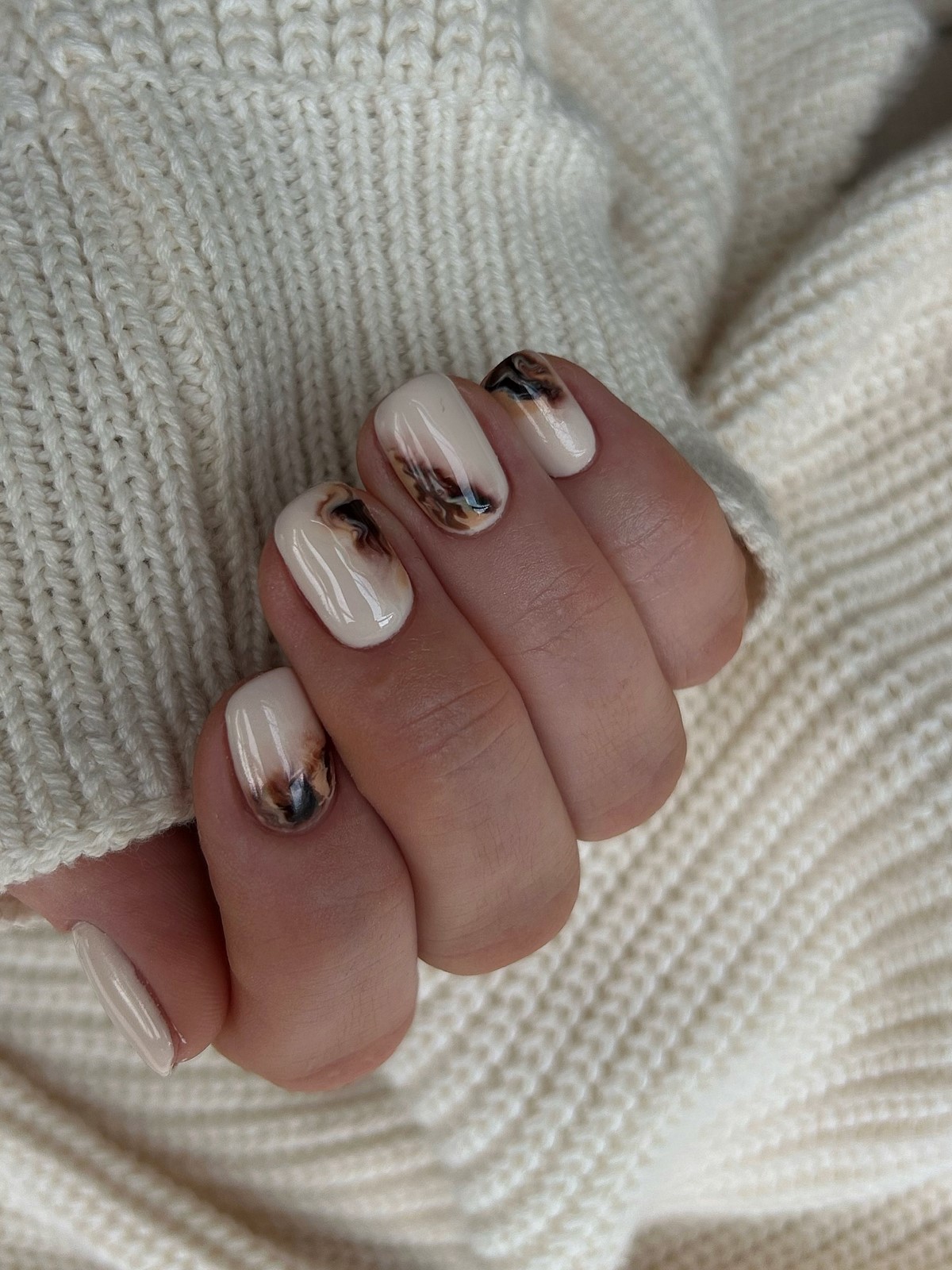 Черепаховий принт нагадує візерунки на теплих аксесуарах. Восени він стає особливо популярним, створюючи відчуття стилю і розкоші. Такий дизайн найкраще виглядає в коричневих і карамельних відтінках. Його можна використовувати як акцент або на всіх нігтях.
