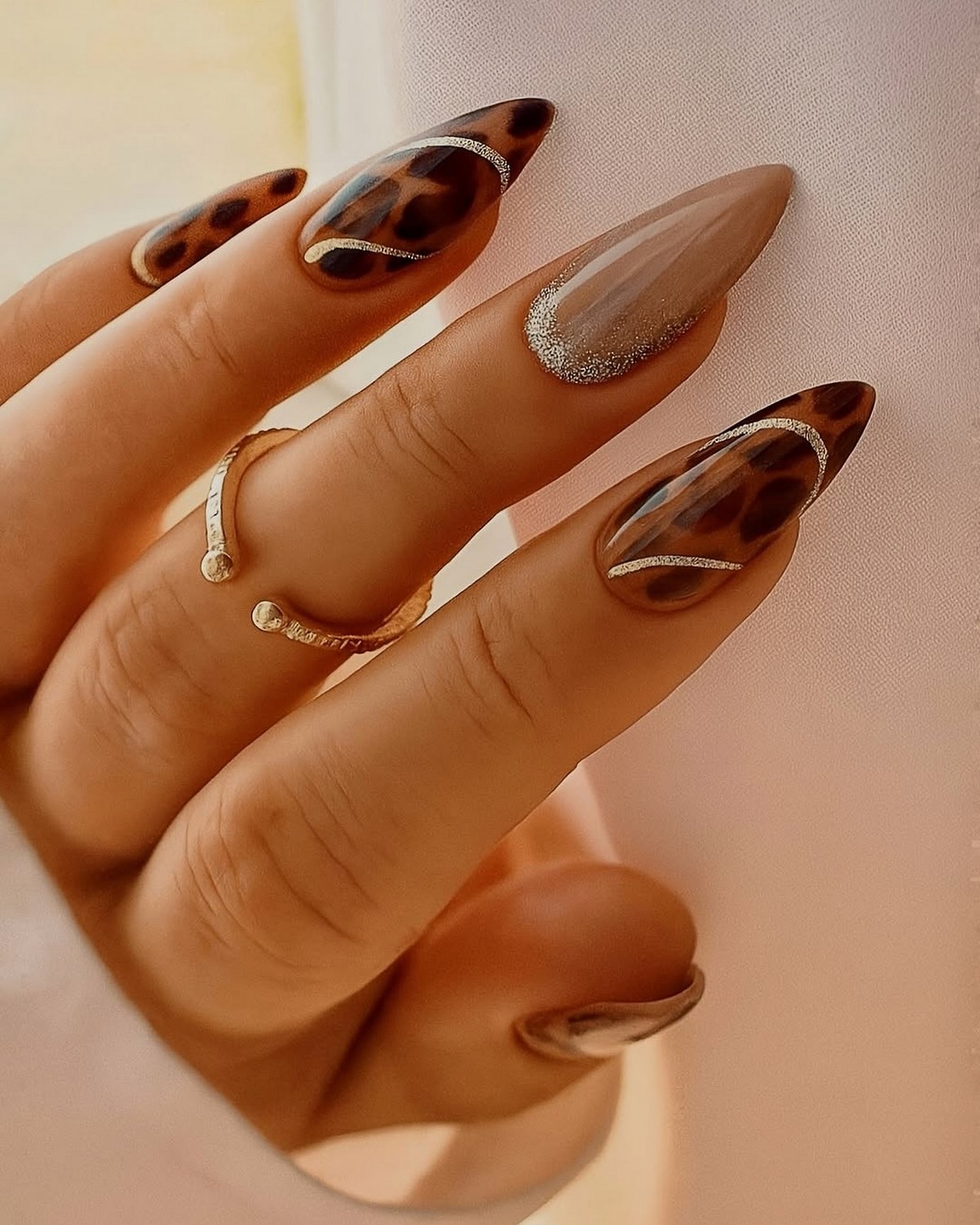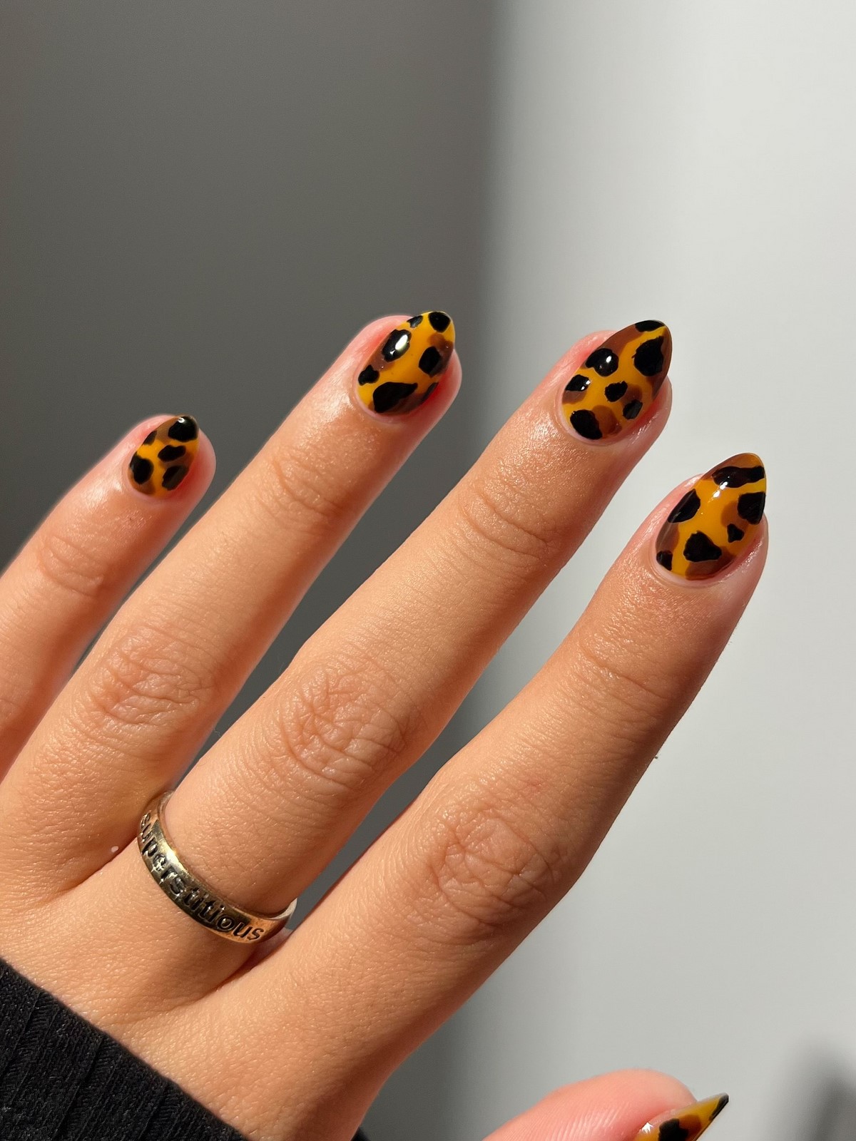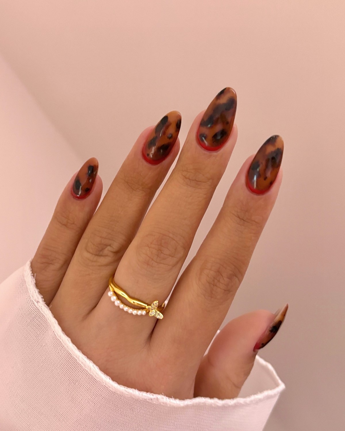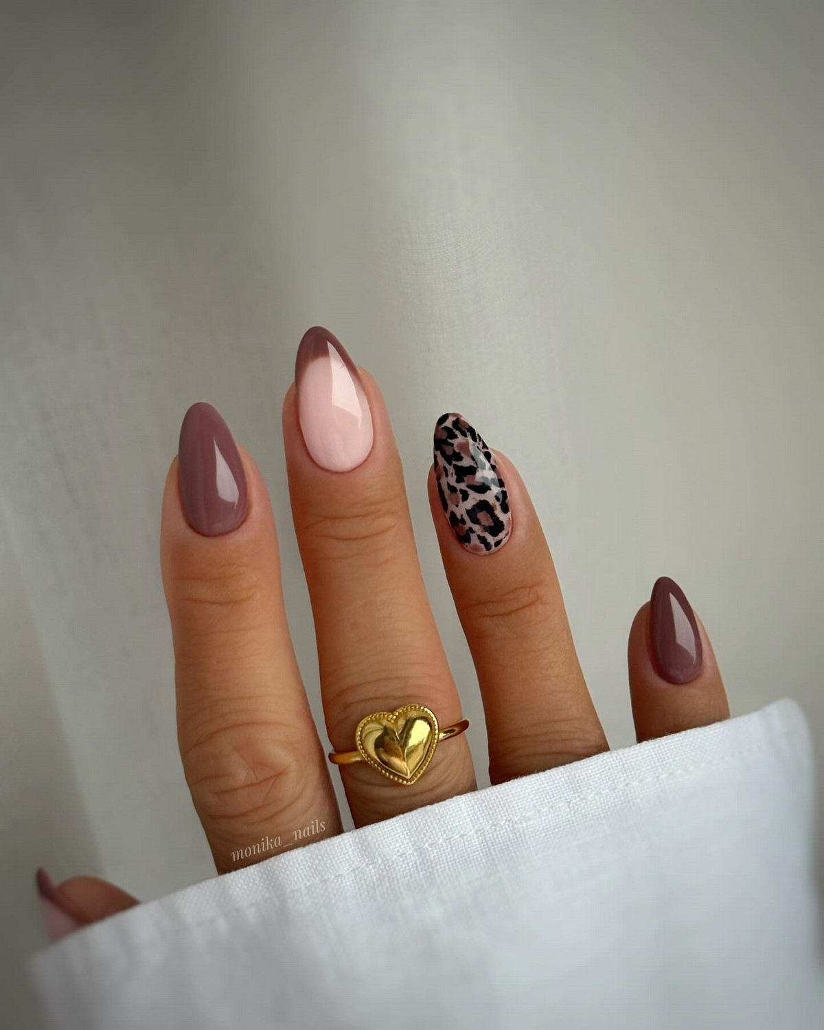 Черепаховий принт нагадує візерунки на теплих аксесуарах. Восени він стає особливо популярним, створюючи відчуття стилю і розкоші. Такий дизайн найкраще виглядає в коричневих і карамельних відтінках. Його можна використовувати як акцент або на всіх нігтях.