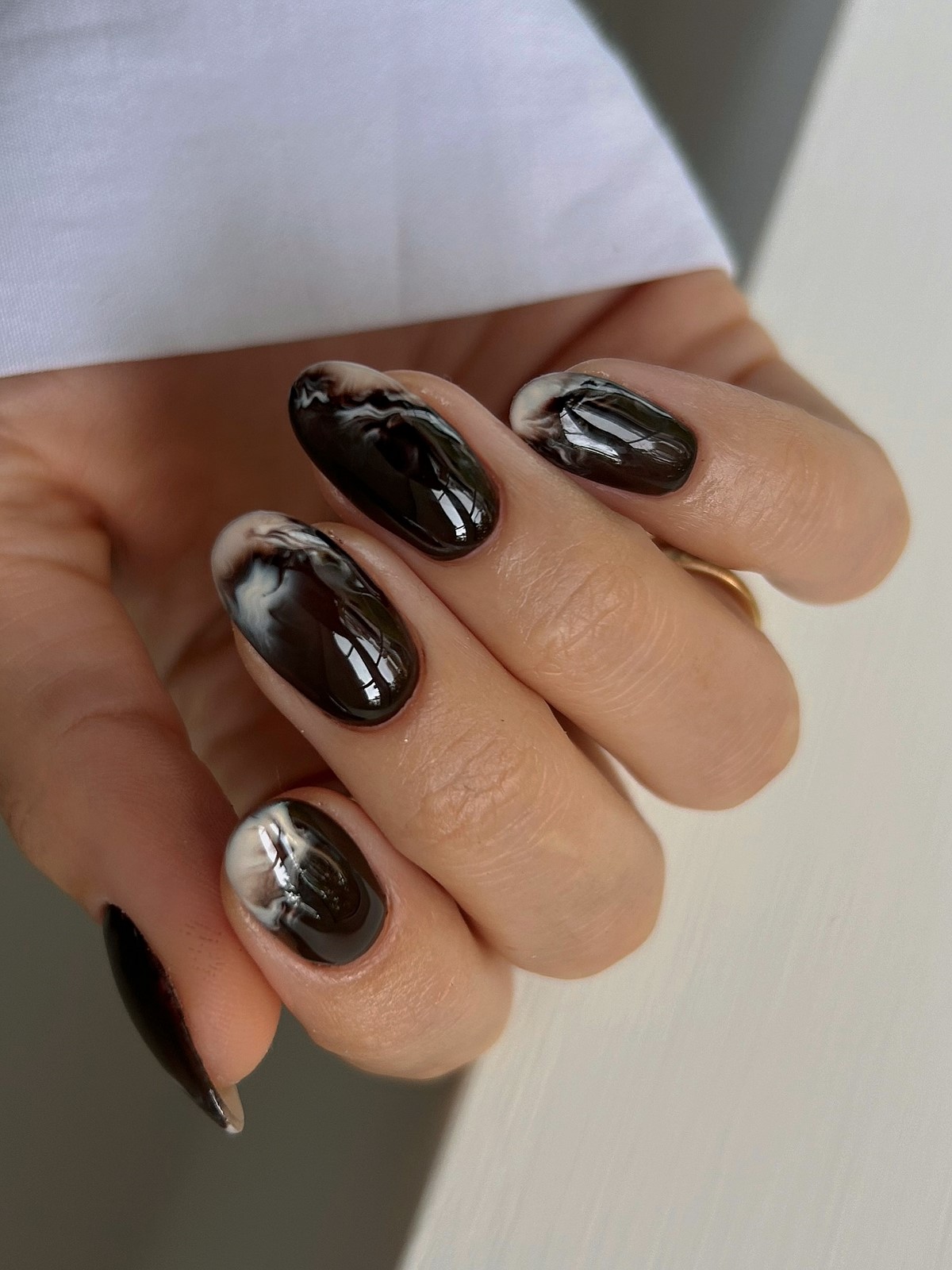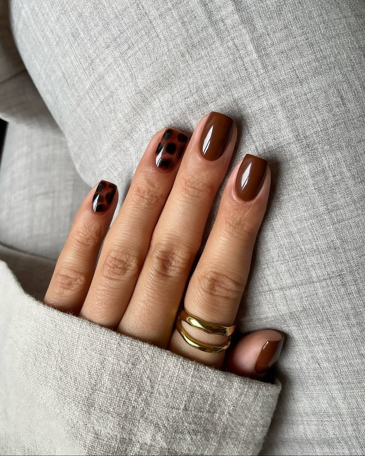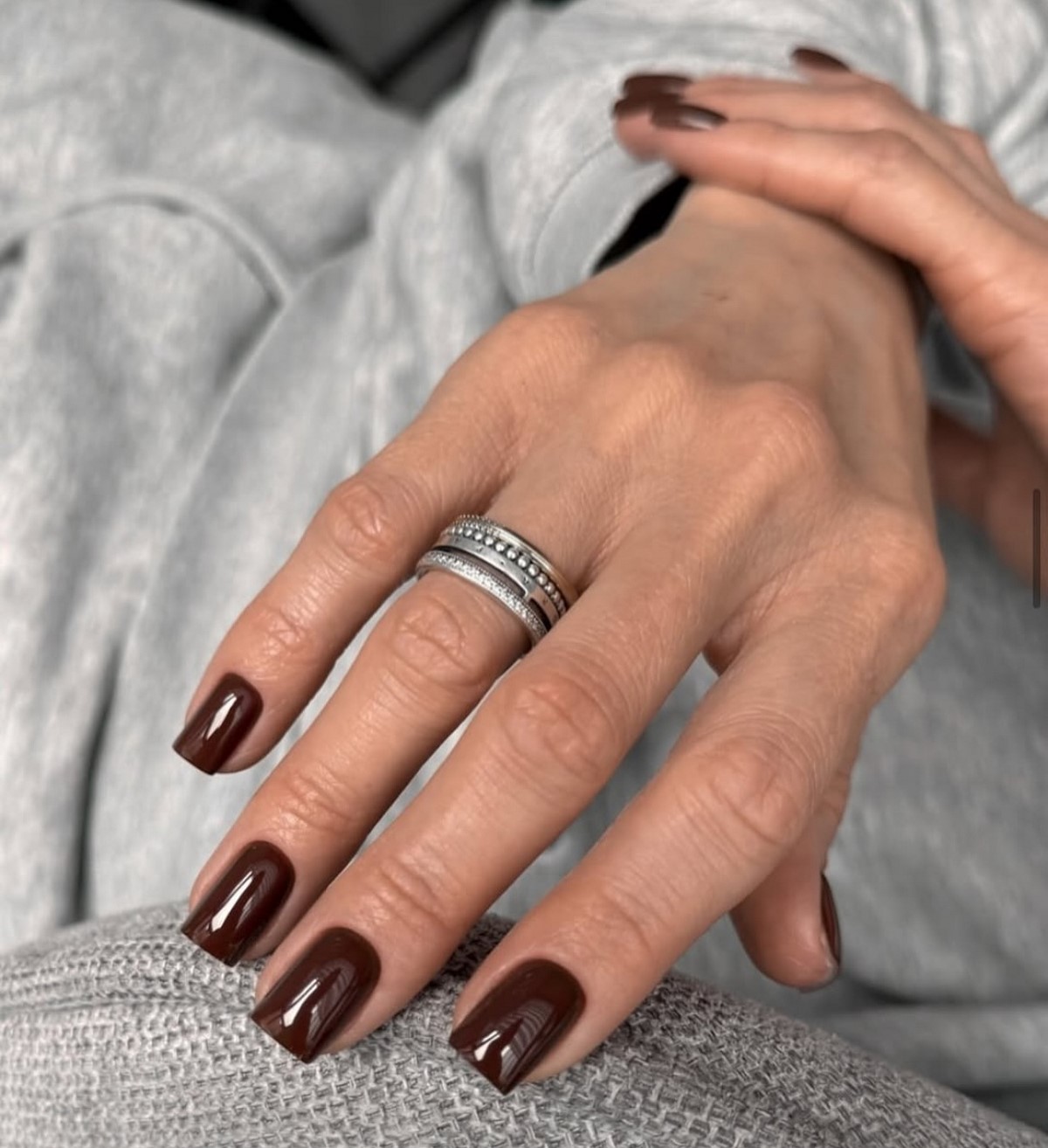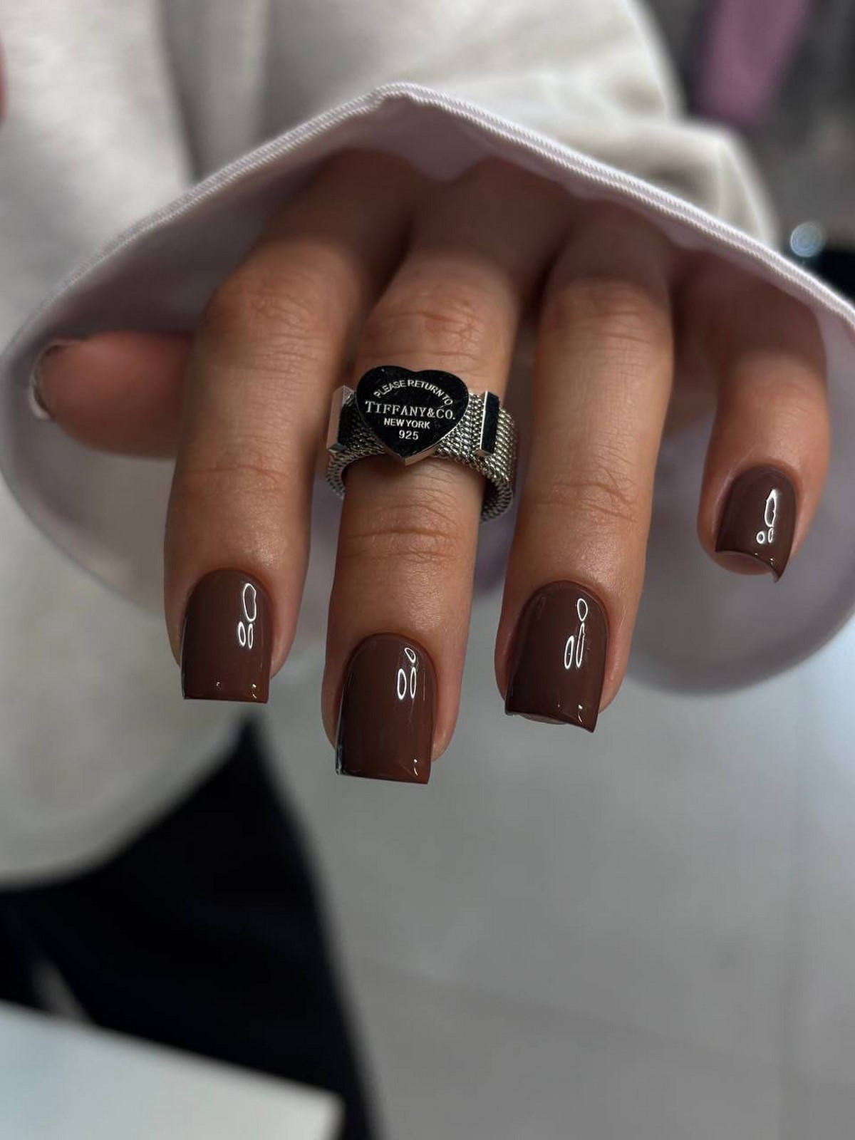 Коричневий — один з головних осінніх відтінків. Він уособлює затишок і тепло. У манікюрі жовтня 2025 коричневий можна використовувати в шоколадних, кавових і карамельних варіаціях. Поєднання з молочним або золотим надає нігтям витонченість і глибину.