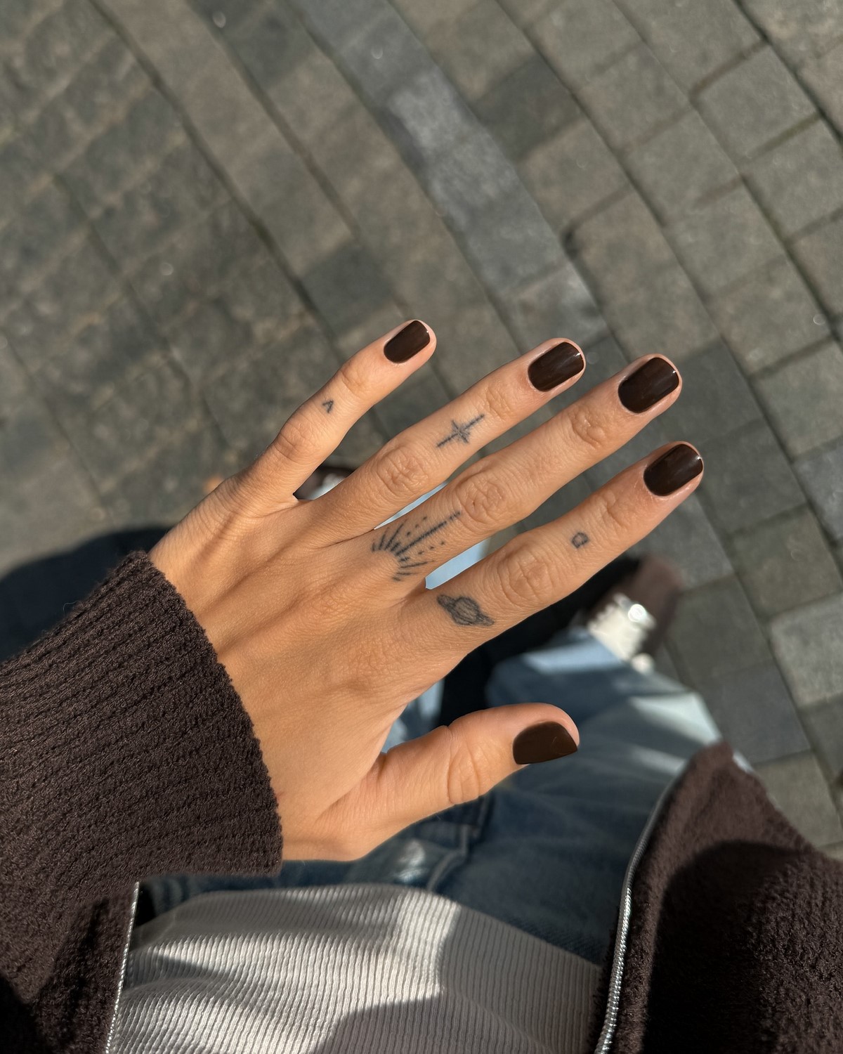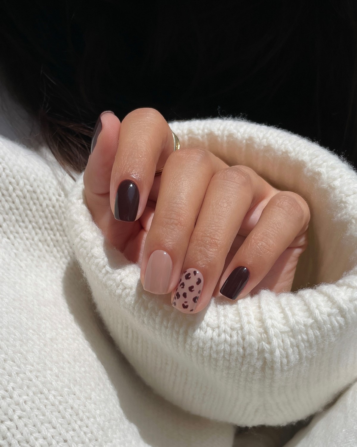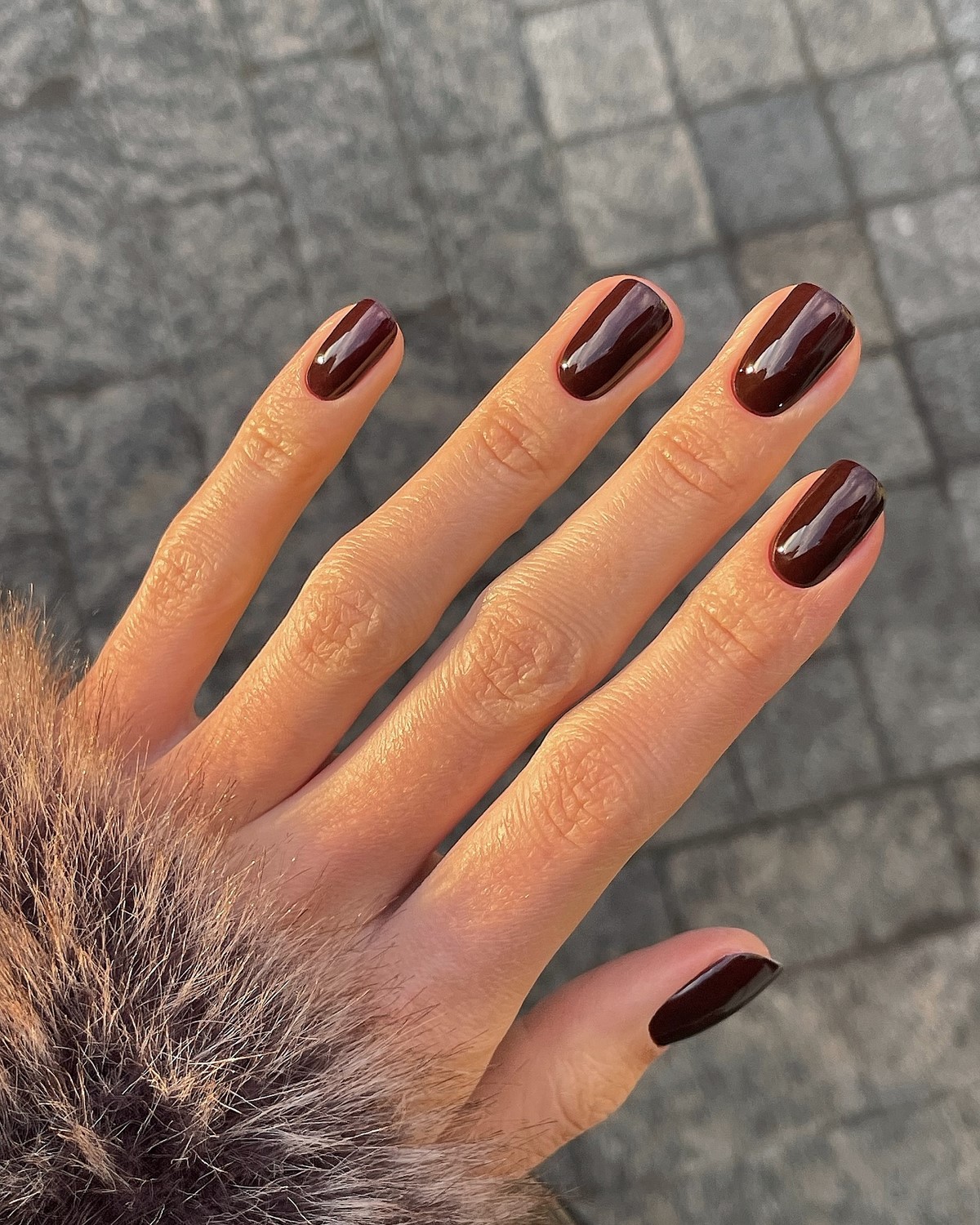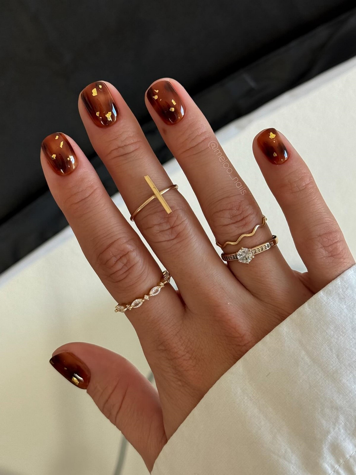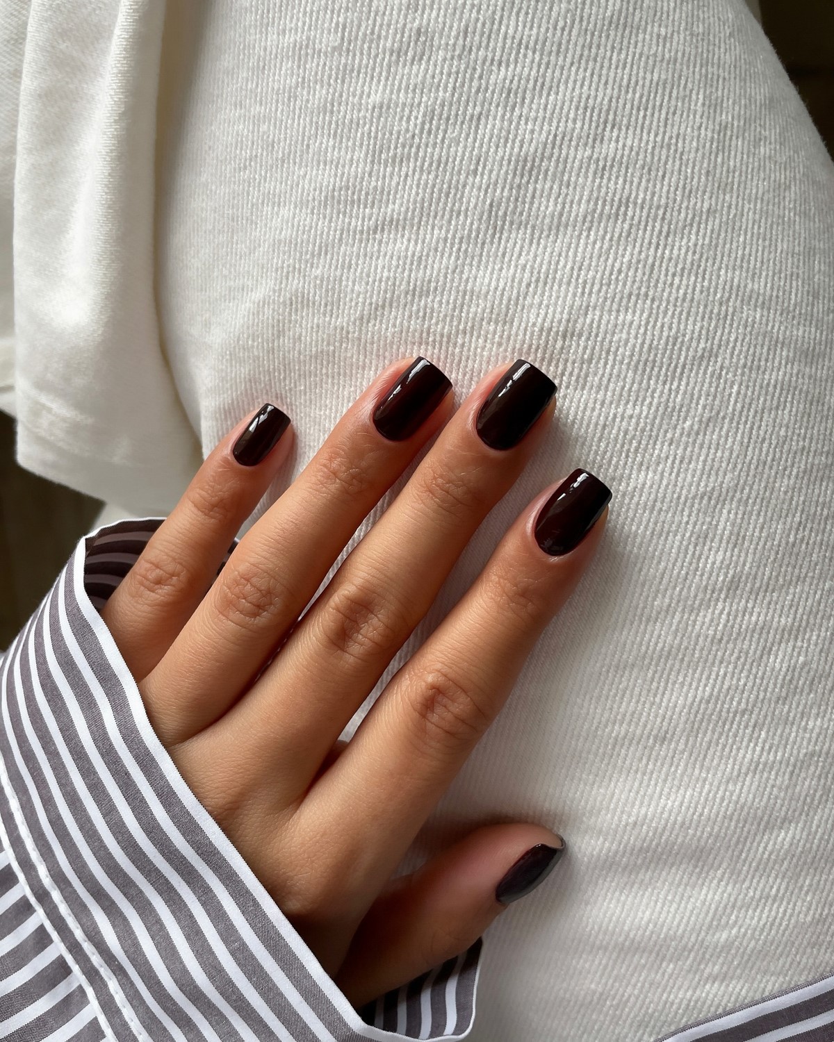Коричневий — один з головних осінніх відтінків. Він уособлює затишок і тепло. У манікюрі жовтня 2025 коричневий можна використовувати в шоколадних, кавових і карамельних варіаціях. Поєднання з молочним або золотим надає нігтям витонченість і глибину.
