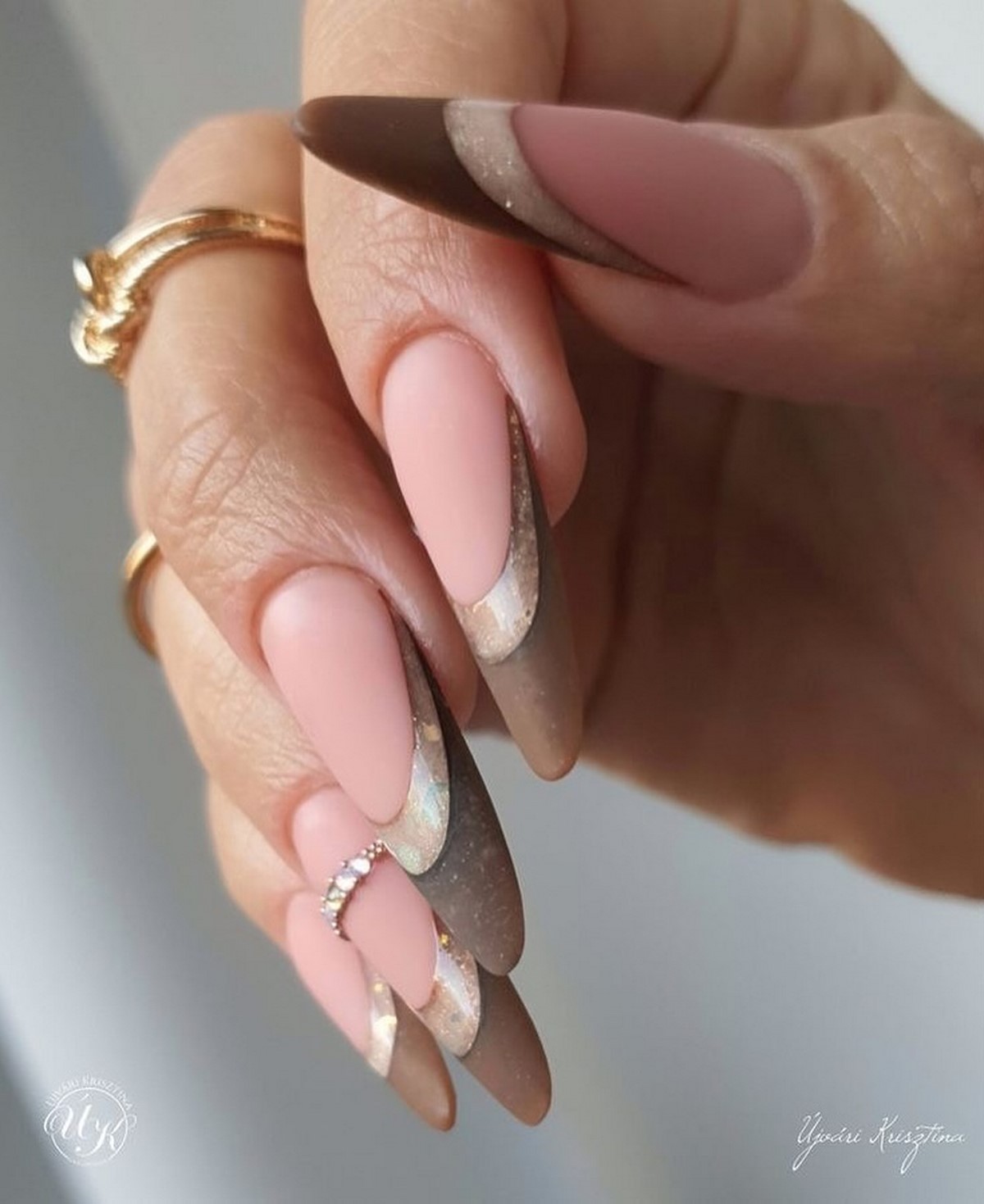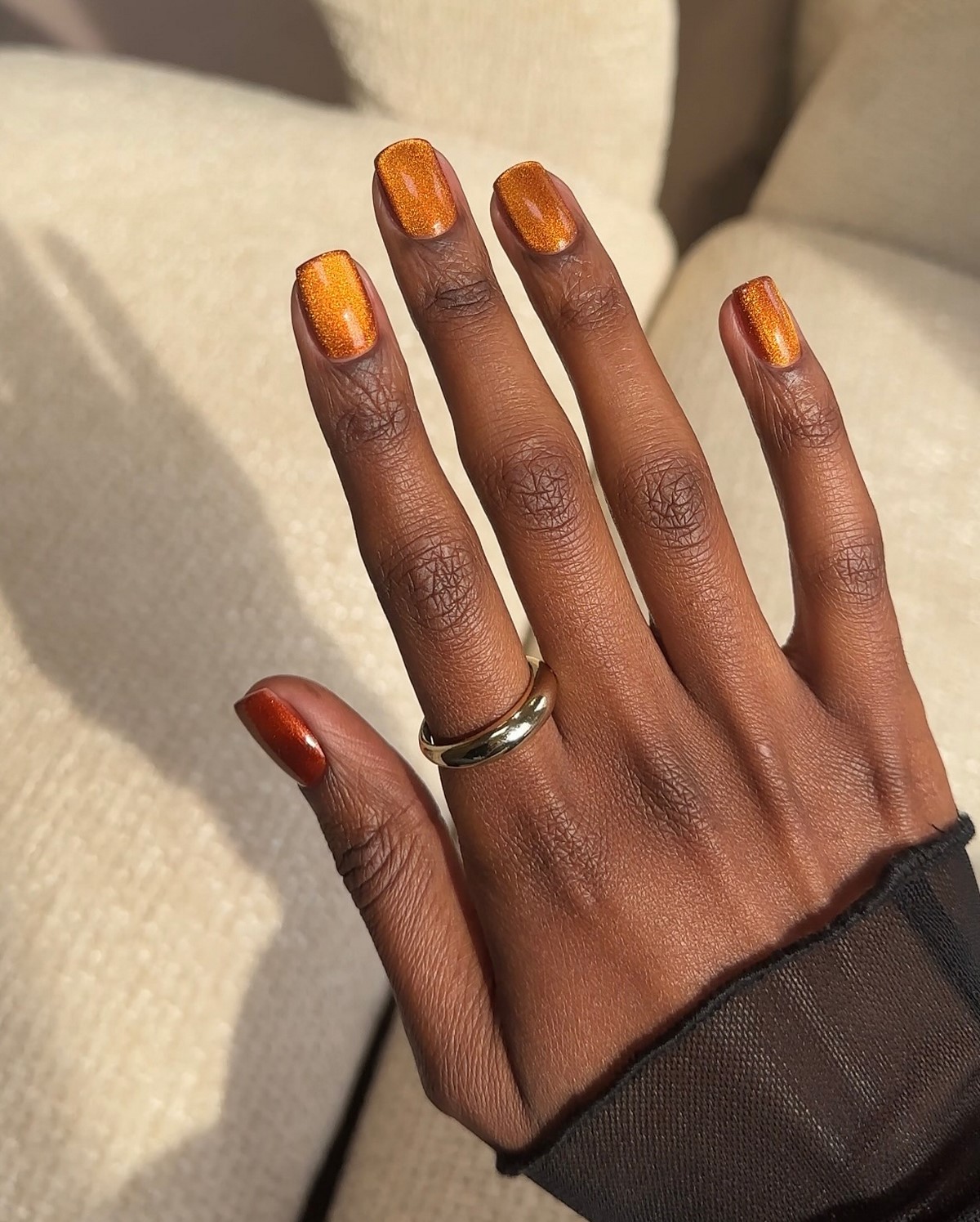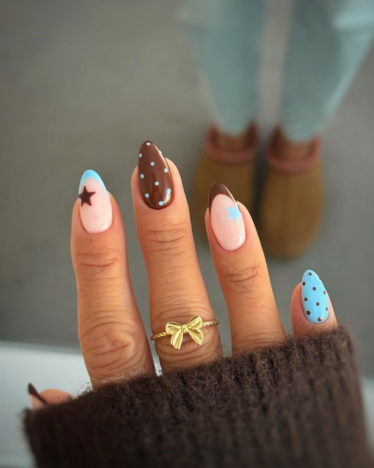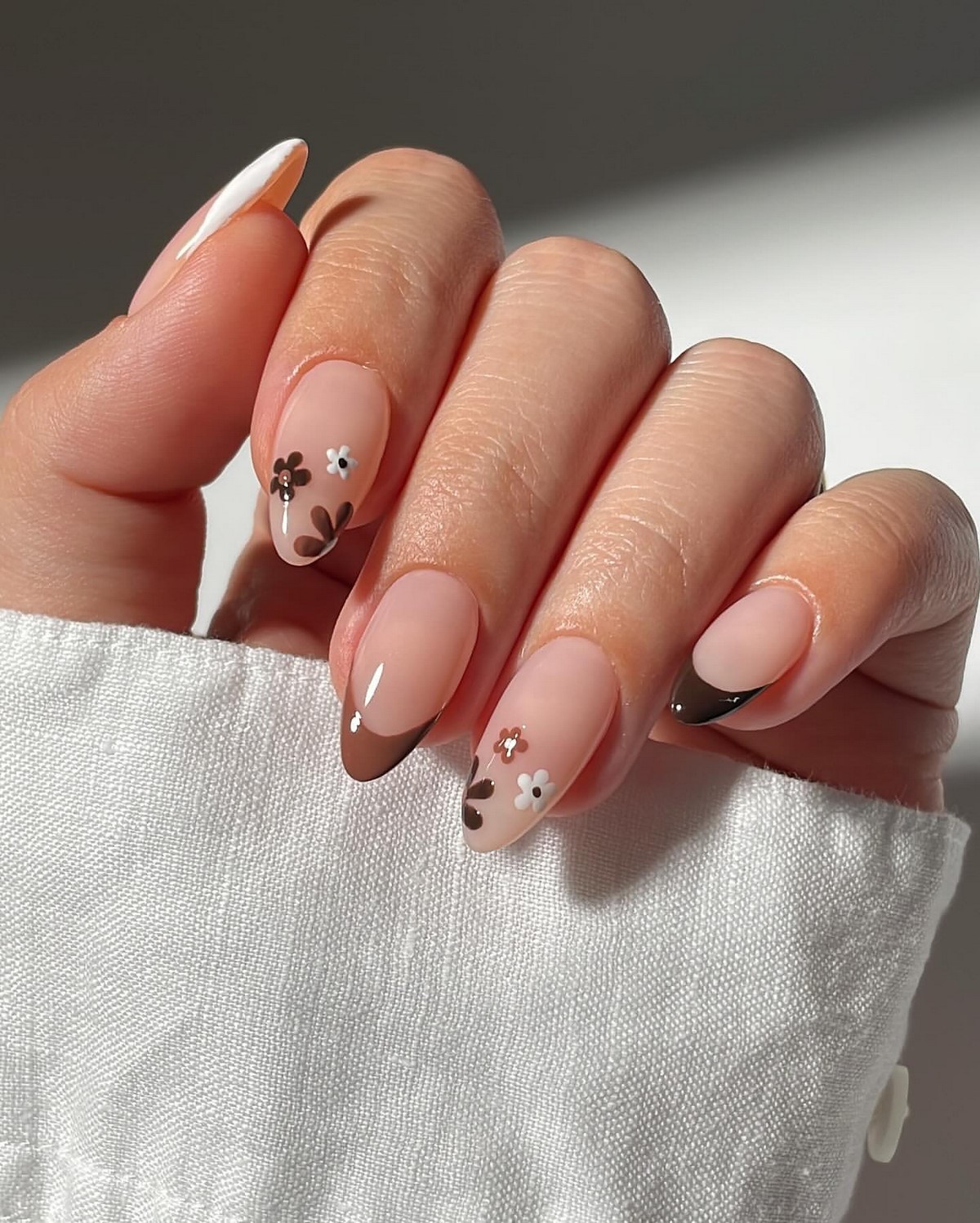 Коричневий — один з головних осінніх відтінків. Він уособлює затишок і тепло. У манікюрі жовтня 2025 коричневий можна використовувати в шоколадних, кавових і карамельних варіаціях. Поєднання з молочним або золотим надає нігтям витонченість і глибину.