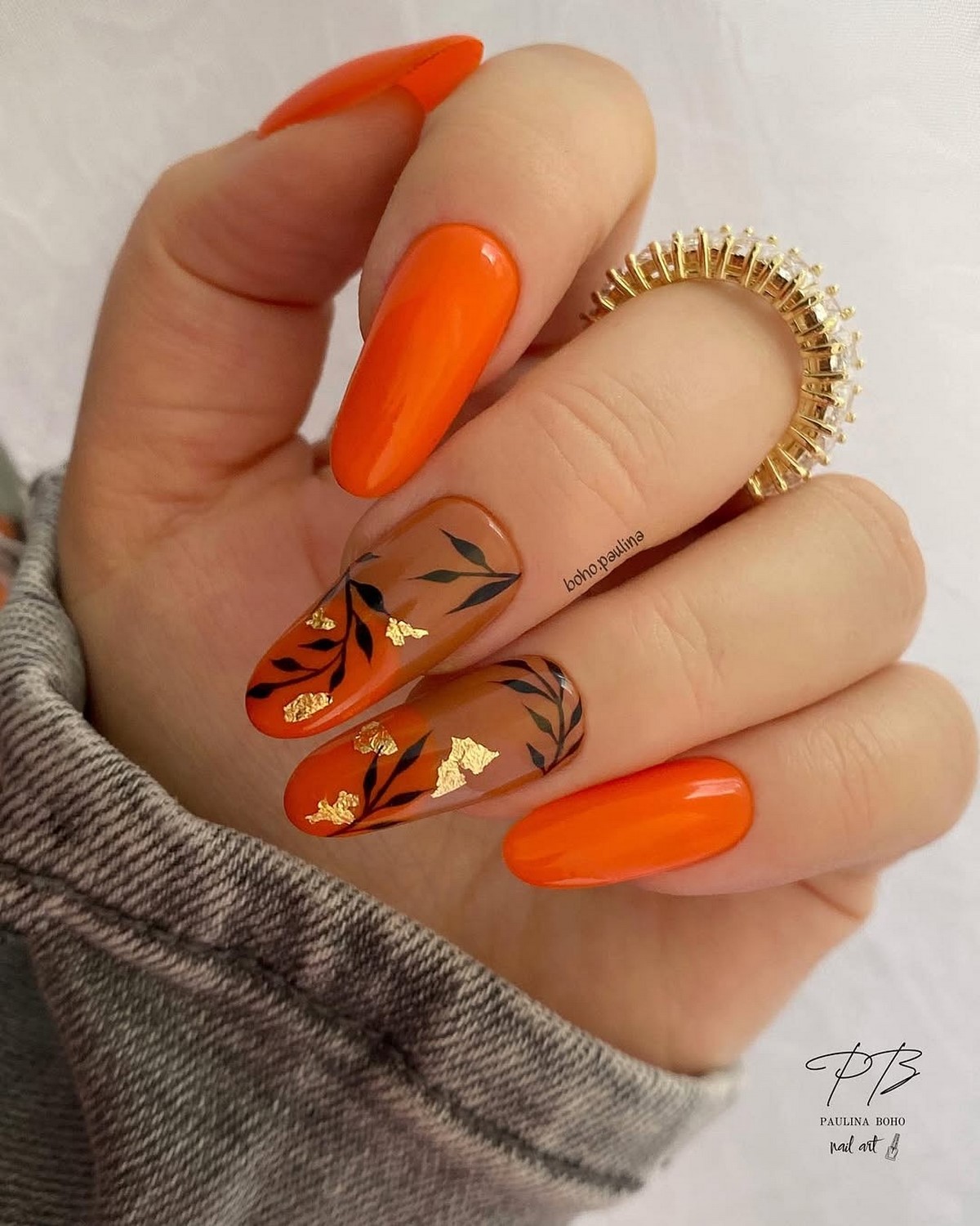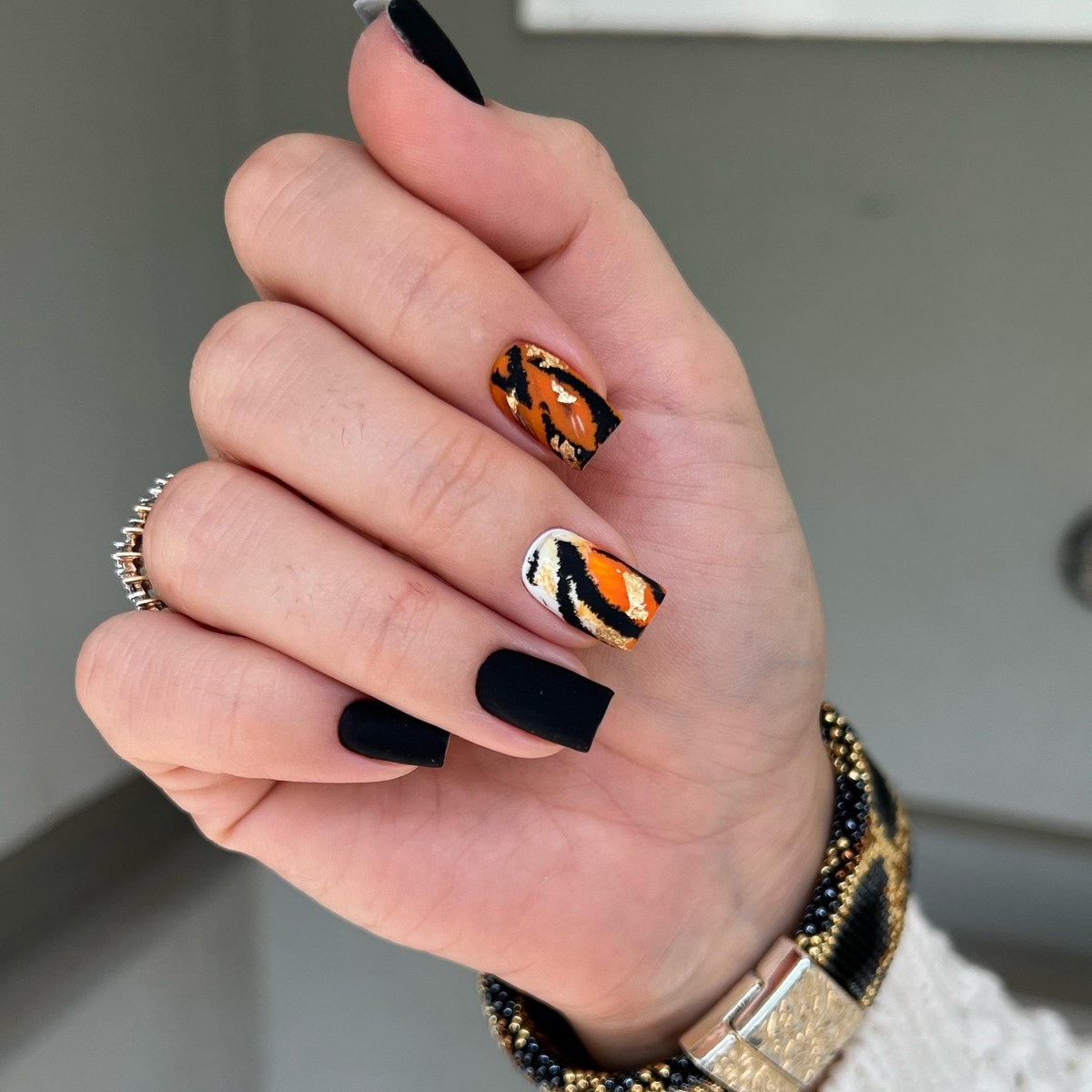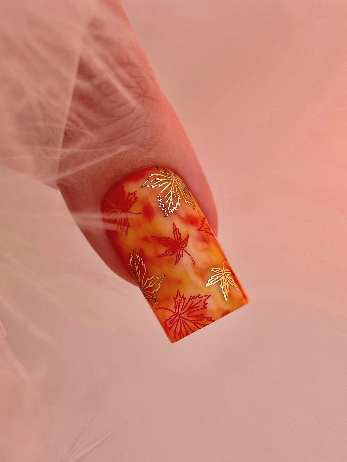 Восени помаранчевий набуває особливого значення — це колір тепла і падаючого листя. Манікюр в помаранчевих відтінках дарує енергію і позитив. Добре виглядає як в матовому, так і в глянцевому виконанні. Для сміливих можна додати градієнт або поєднання з чорним — такий дует особливо ефектний.