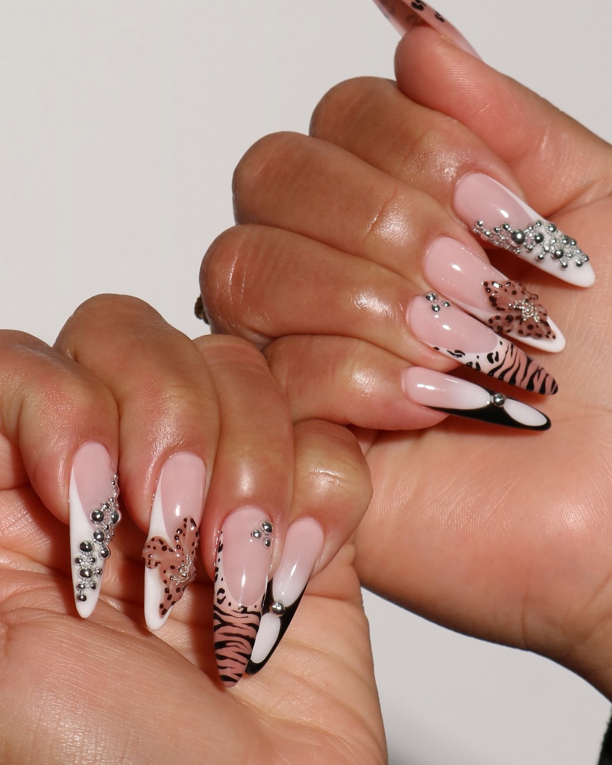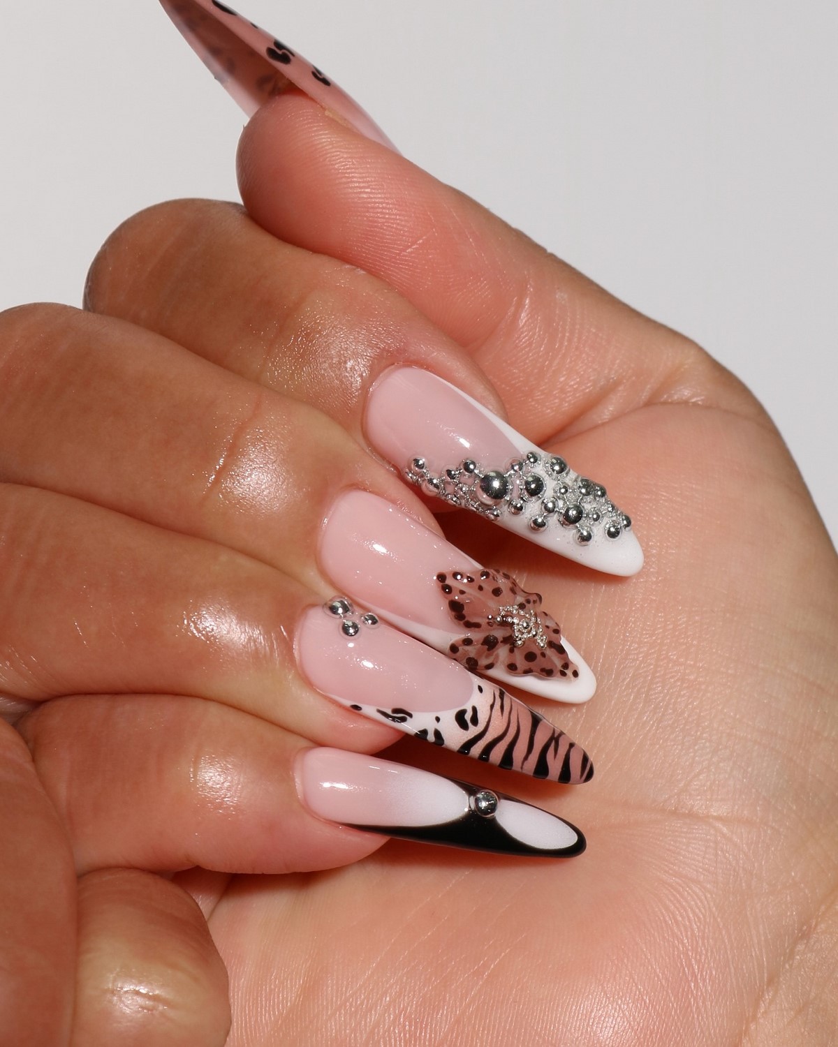 Mix and Match — найкреативніший варіант зимового анімал-манікюру 2025-2026. Тут майстри поєднують відразу кілька принтів: зебру, змію, черепаху, корову, і при цьому зберігають єдиний стиль. Секрет — загальна палітра: наприклад, поєднання сірих, білих і сріблястих відтінків створює модний зимовий ефект.