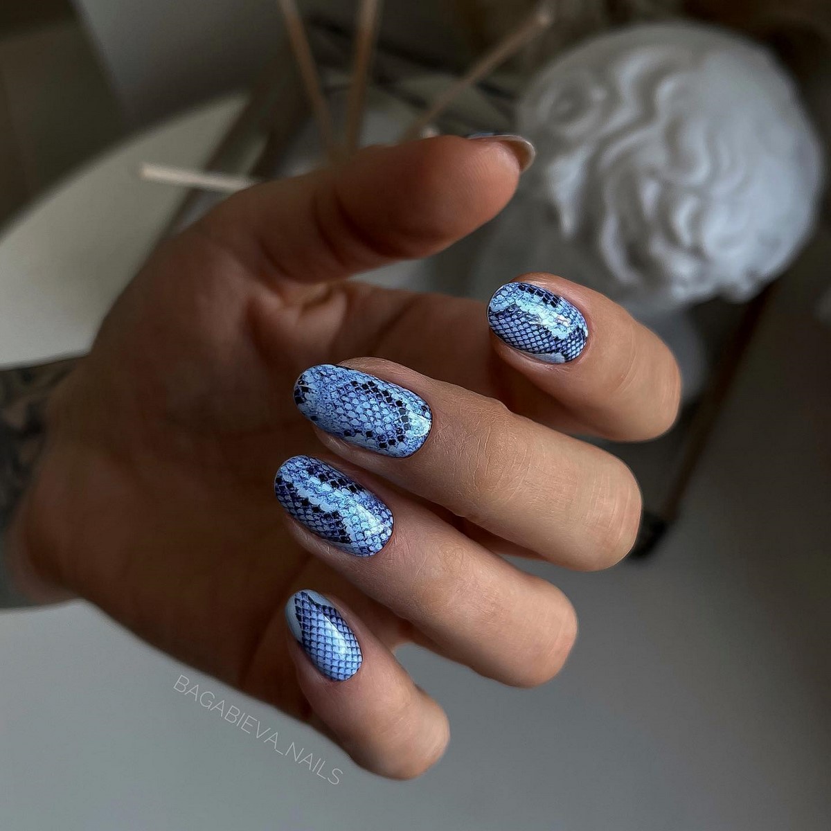 Зміїний візерунок взимку 2025-2026 переходить з розряду зухвалого в розряд преміального. Майстри вибирають холодні відтінки металік — сріблястий, графіт, сапфіровий — і наносять текстуру з ефектом l scales. Такий манікюр виглядає дорого, особливо на короткій або середній довжині нігтів.