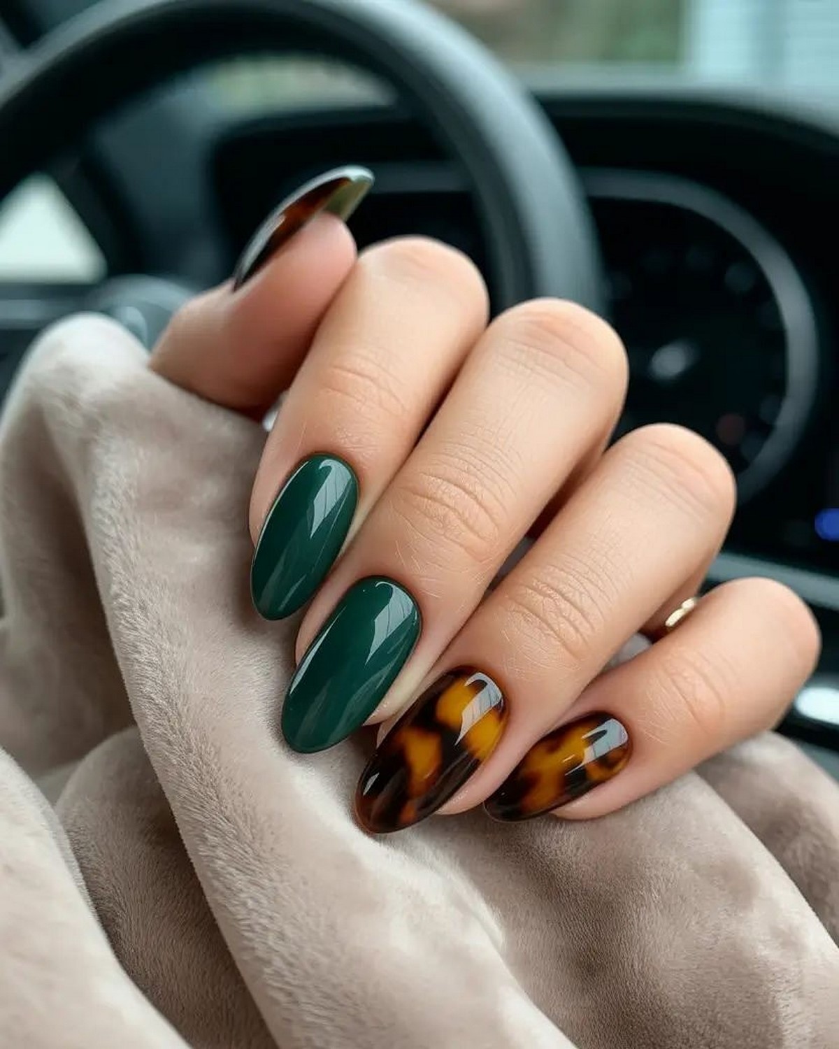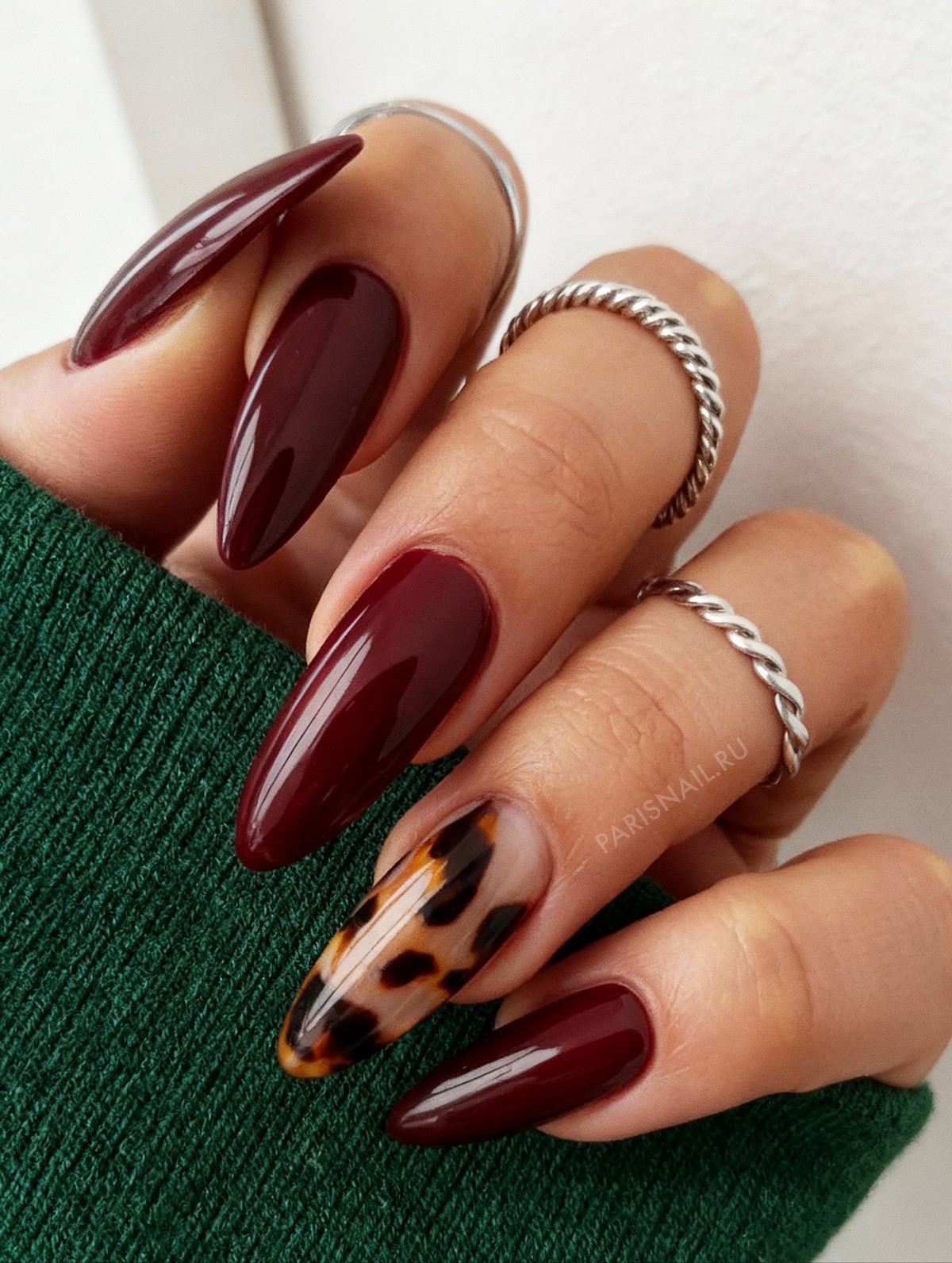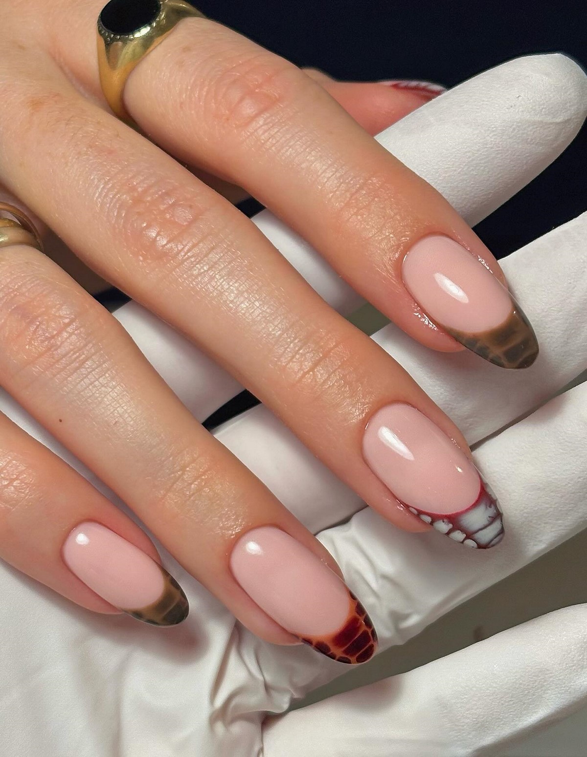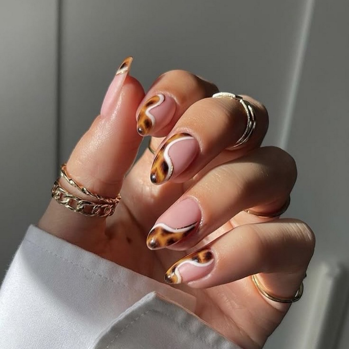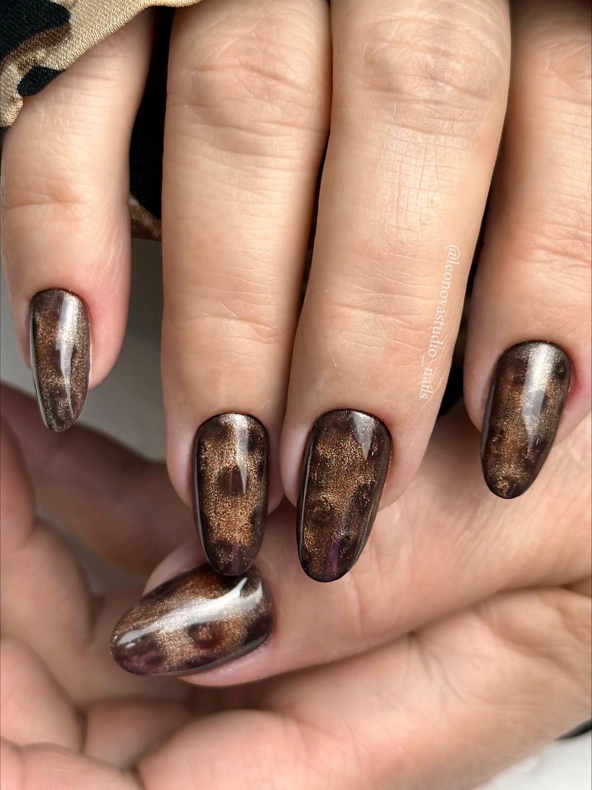 Черепаший манікюр взимку виглядає особливо благородно завдяки глибоким карамельним і тепло-коричневим відтінкам. Ефект скляного шару і м’які переходи роблять дизайн по-справжньому зимовим — він нагадує затишок, тепло каміна і природну хроматику холодного сезону.