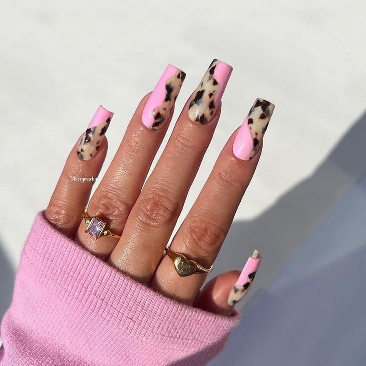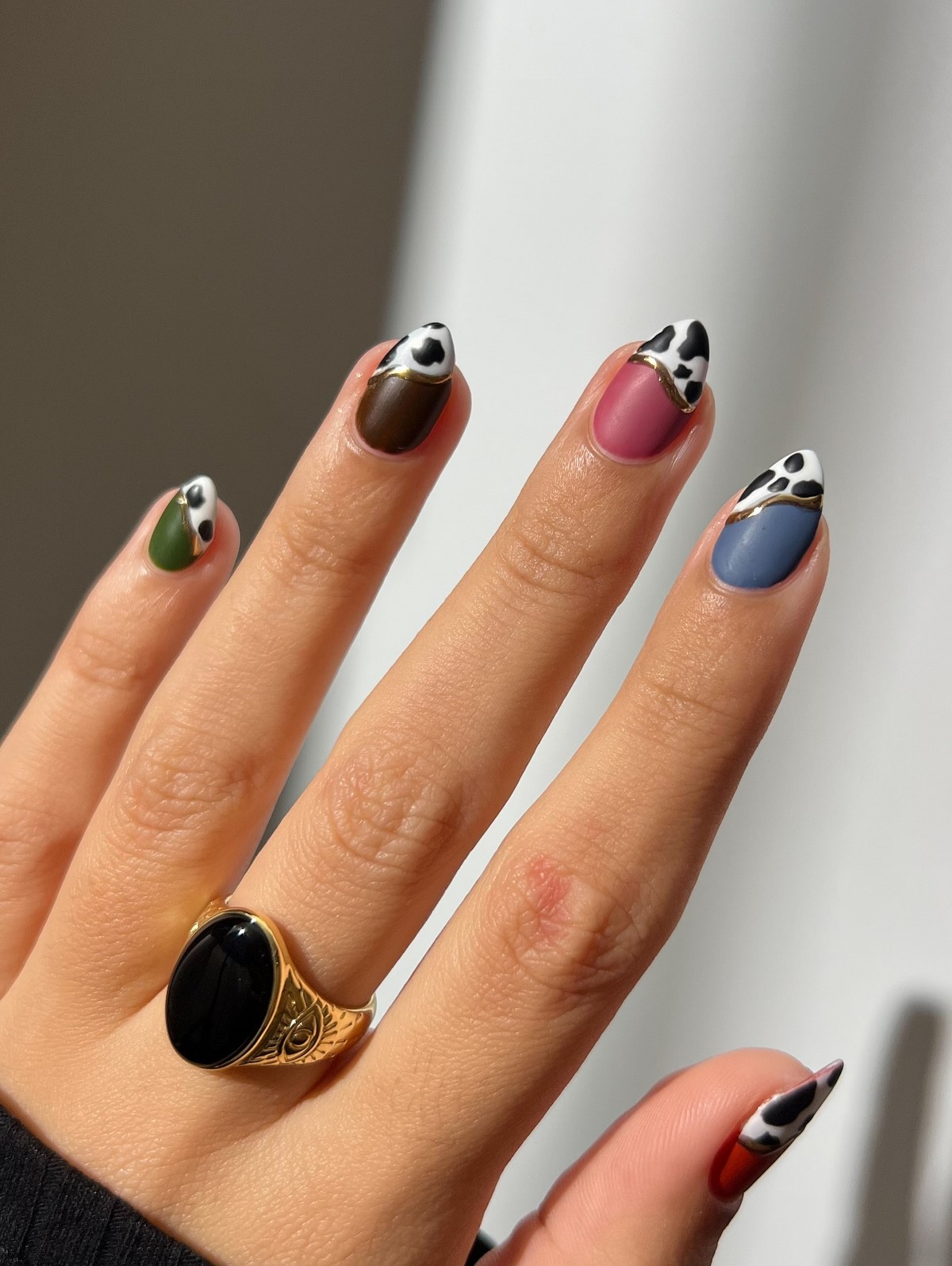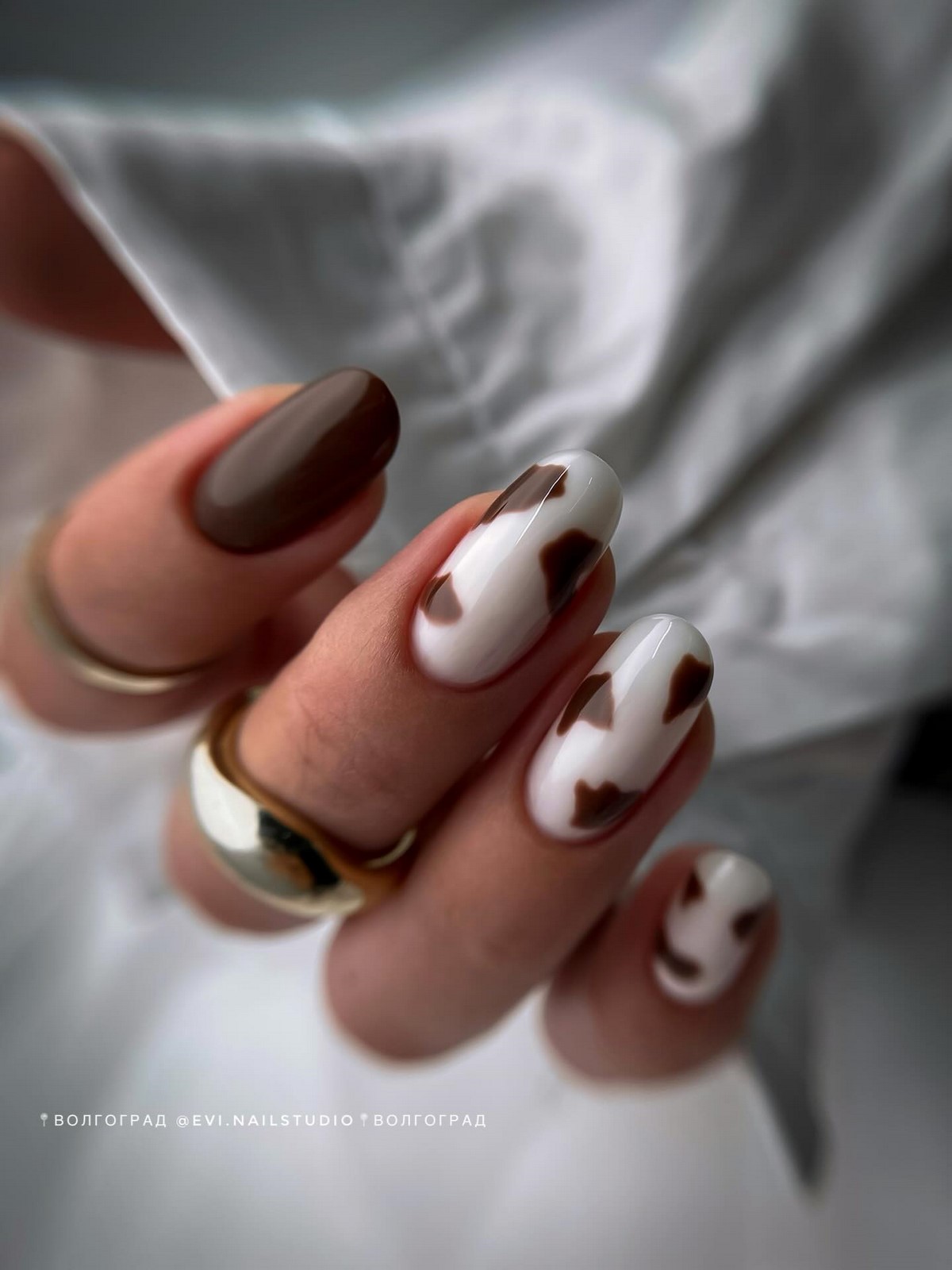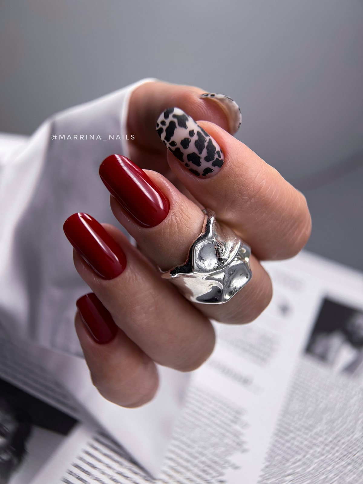 Дизайн вдало вписується в мінімалістичний манікюр: достатньо зробити акцент на одному-двох нігтях. Коровий принт також відмінно поєднується з французьким манікюром — плями можуть розташовуватися по лінії посмішки або під шаром прозорого топа.