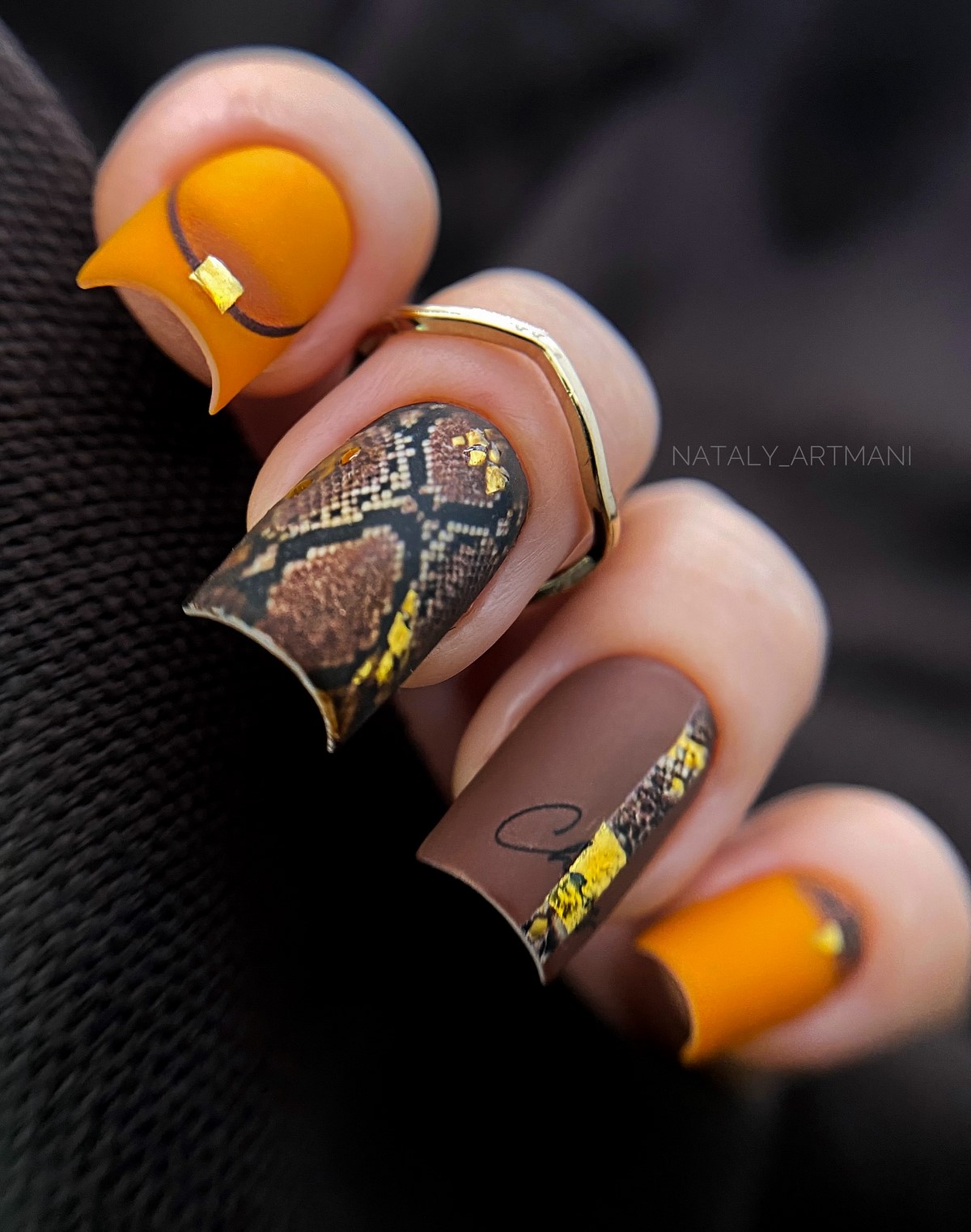 Найчастіше майстри роблять об’ємну «шкіру» за допомогою гелю або використовують глянцеві вкраплення на матовій основі — це створює ефект реалістичних лусочок. Такий дизайн відмінно поєднується з однотонними нігтями або строгим чорним френчем.