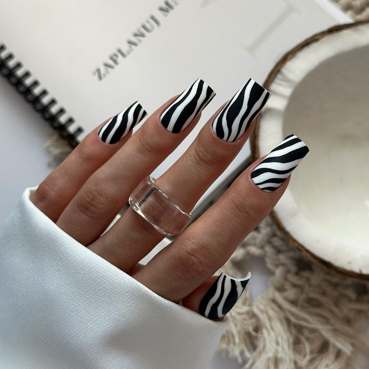 Зебра красиво працює в поєднанні з френчем: смуги можуть повторювати лінію посмішки або переходити на один-два нігті як акцент. А ще принт відмінно виглядає в форматі слайдерів — ідеально рівних, як у професійній зйомці.