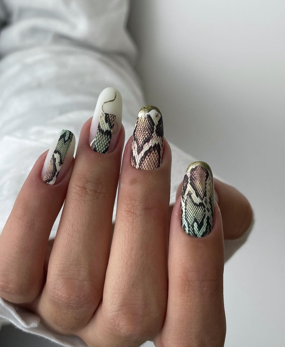 Принт гармонує з технікою «котяче око», створюючи враження сяйва, ніби світло переливається між лусочками. У моді також зміїні слайдери, які дозволяють зробити ідеальний малюнок без ручного промальовування.