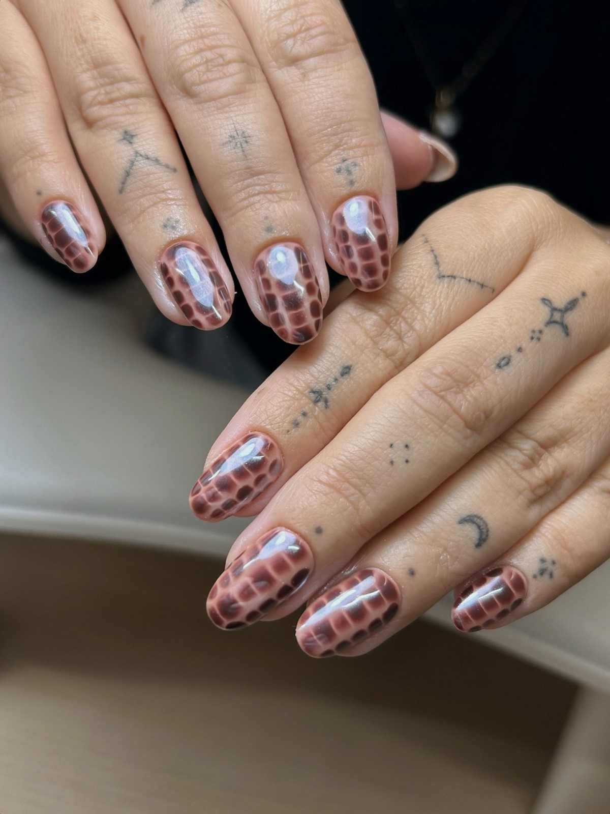 Крокодилячий манікюр — ще один зимовий хіт, який став популярним завдяки фактурній тенденції. Об’ємні елементи, матові поверхні і глибокі відтінки зробили його ідеальним для холодної пори року. Особливо в топі кольори соснової зелені, чорний шоколад, бордо.