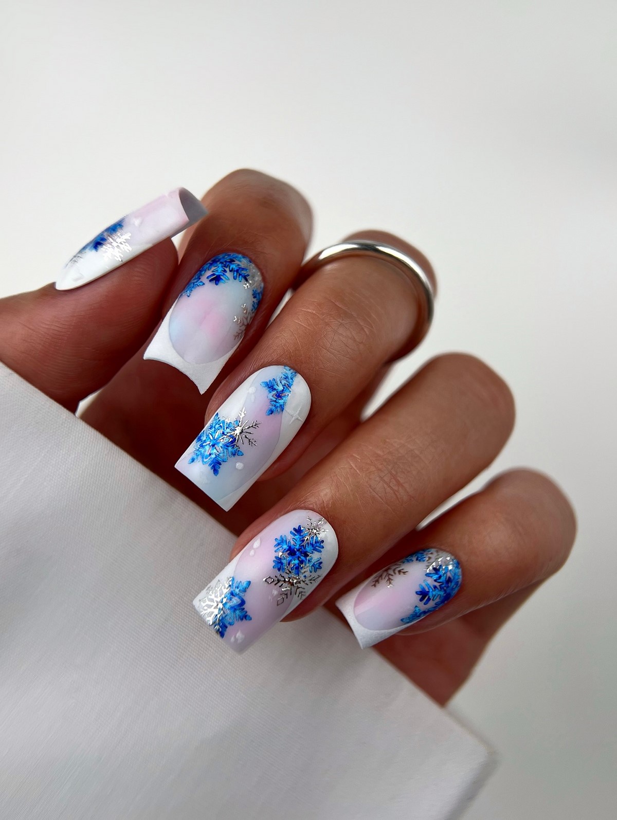 Градієнтний зимовий манікюр зі сніжинками — це плавний перехід відтінків, який створює ефект м’якого неба або засніженого горизонту. Найбільш популярні переходи білого в блакитний, молочного в сріблястий або синього в темно-фіолетовий.