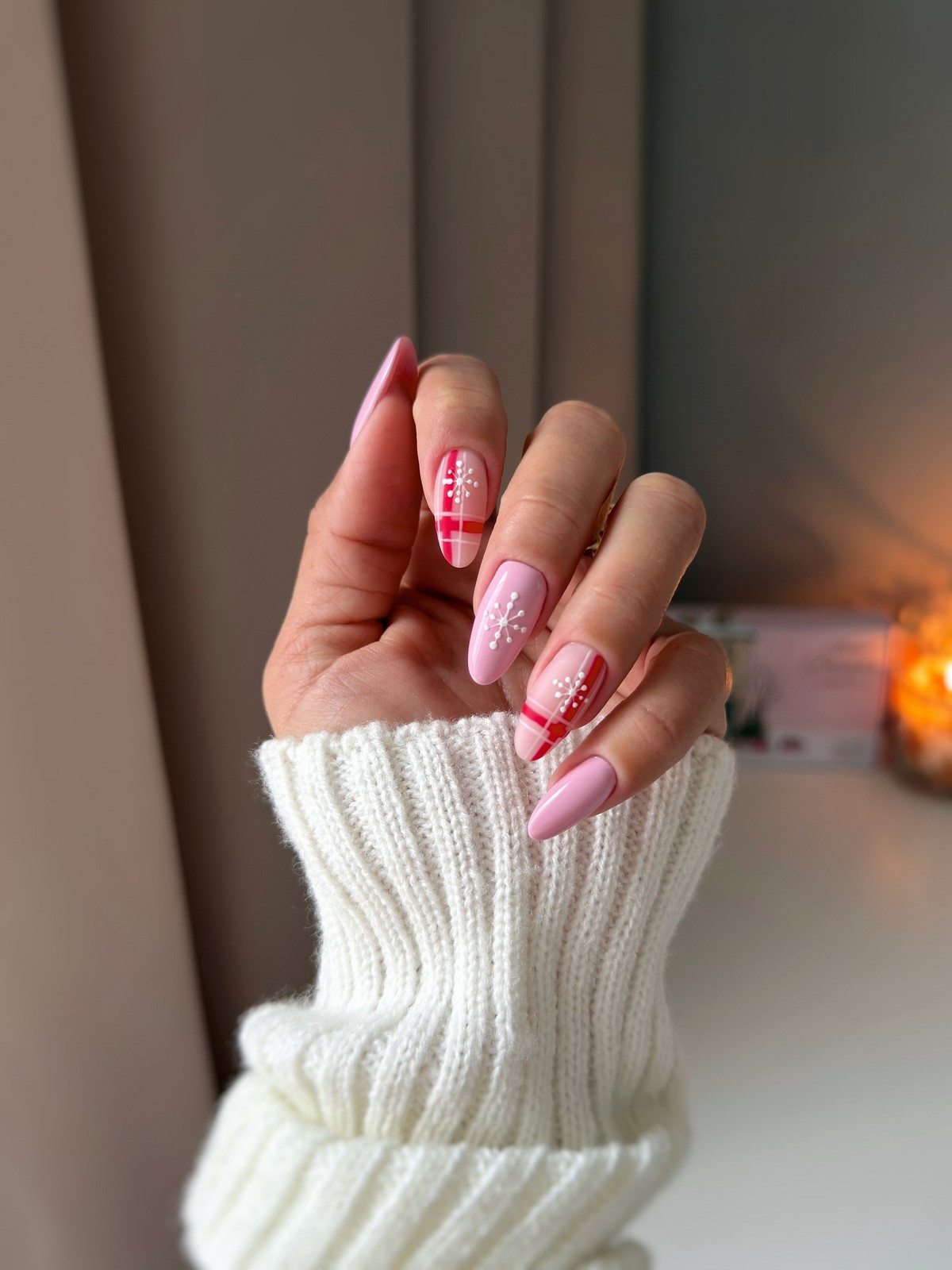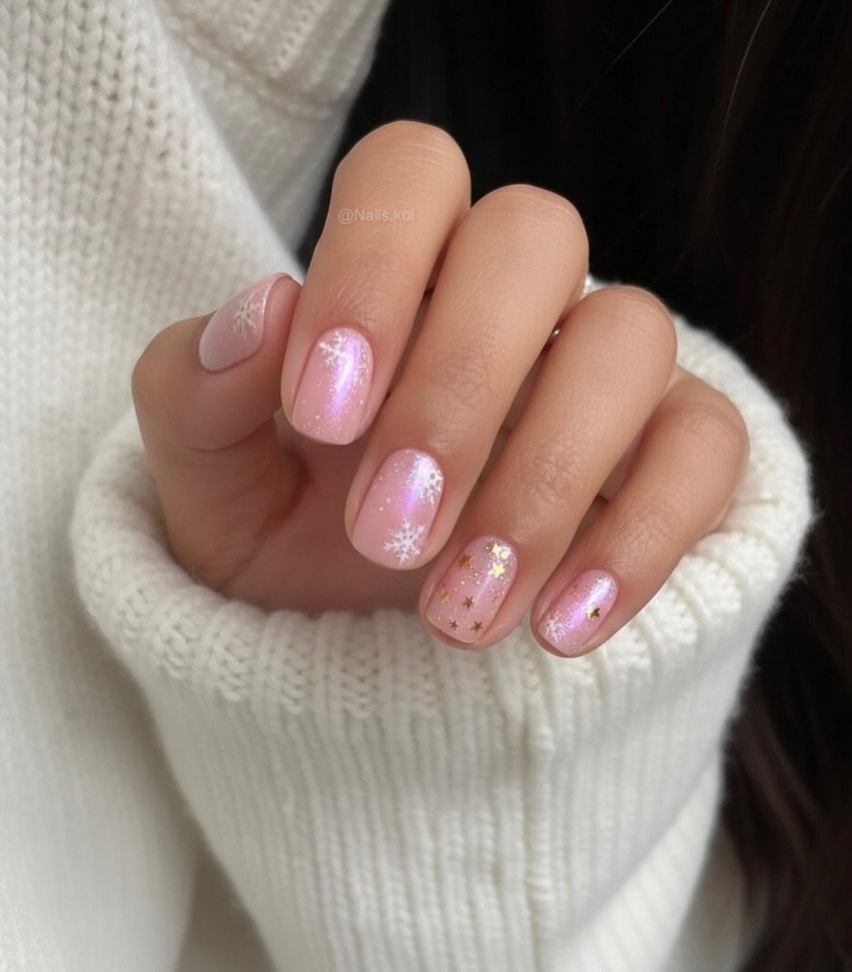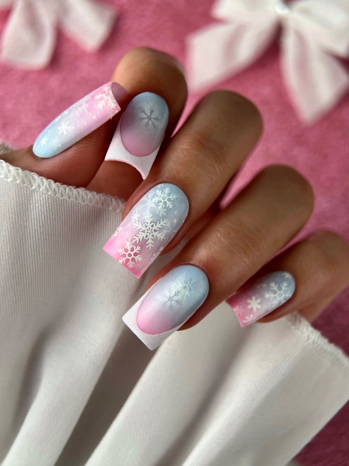 Ніжні зимові нігті — це пастельні тони, м’які переходи і повітряні сніжинки. Молочний, кремовий, ніжно-рожевий і персиковий відтінки створюють легкий, майже невагомий образ. Такий манікюр ідеально підходить для весіль взимку і новорічних корпоративів.