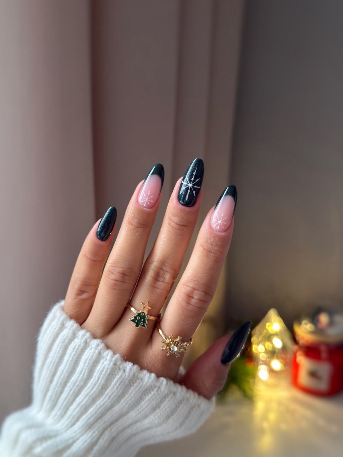 У 2025–2026 роках в моду входять оксамитові текстури (cat eye), які додають манікюру глибини і загадкового сяйва. Сніжинки на темному тлі можуть бути матовими або сяючими — обидві версії виглядають розкішно.
