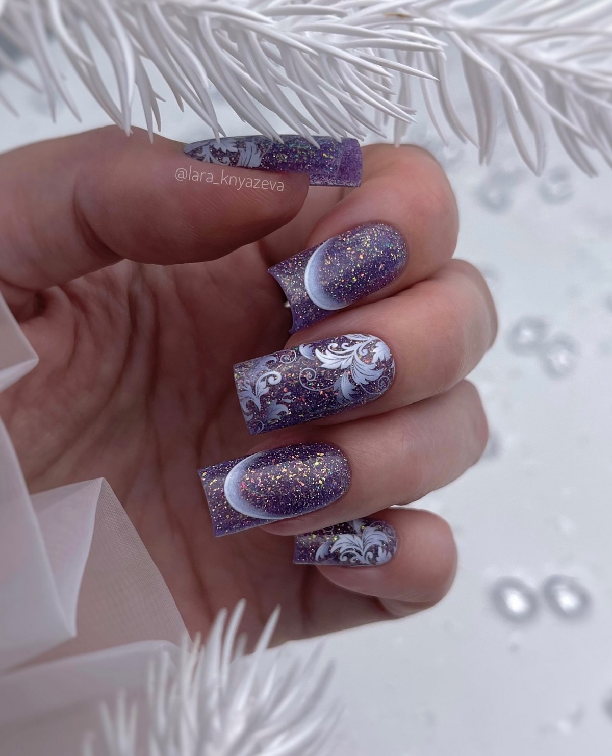 Сніжинки тут можуть бути виконані в техніці «тонкі лінії» або з використанням прозорого моделюючого гелю для ефекту 3D інею. Це модно, акуратно і дуже жіночно.
