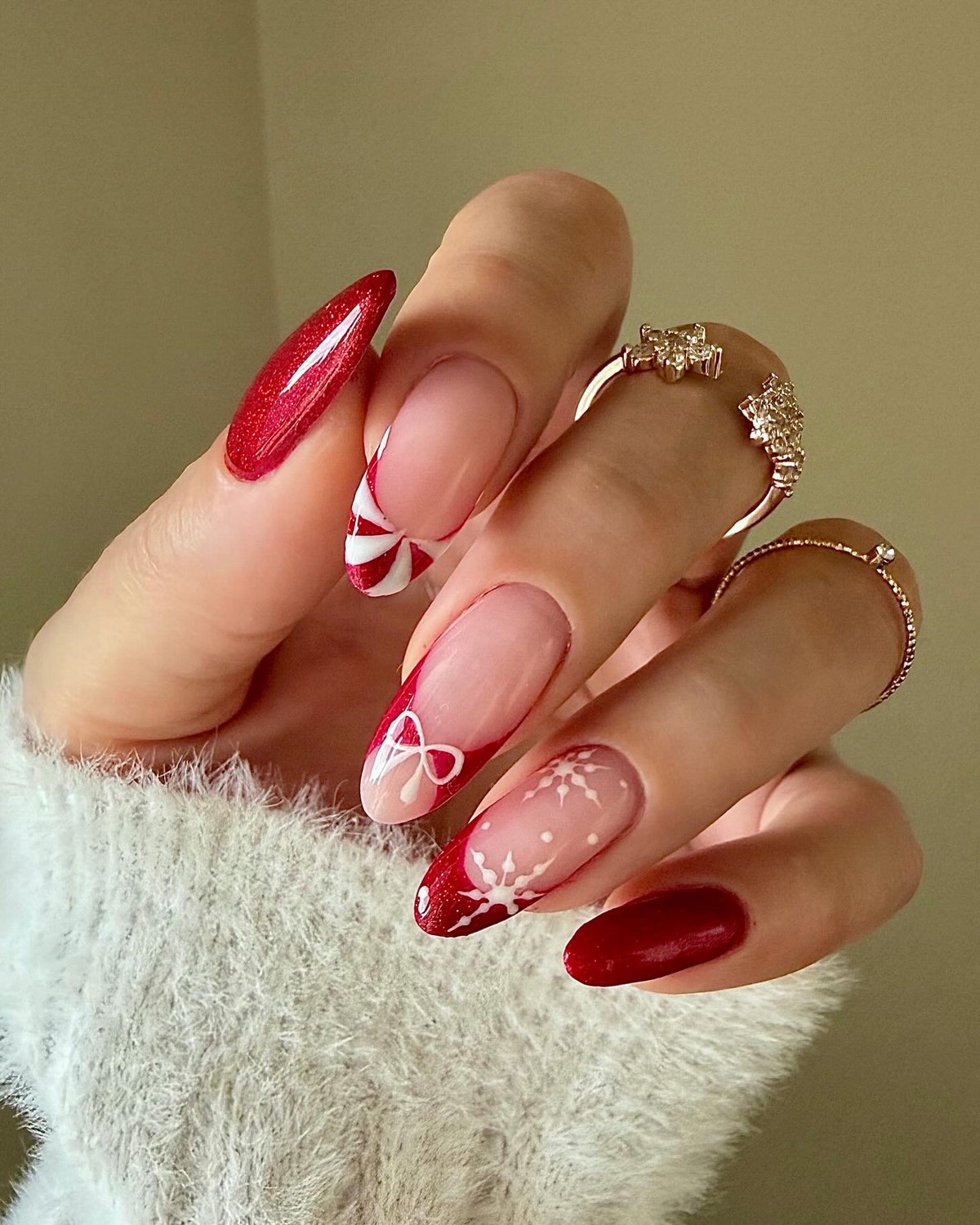 Mix and Match — найтрендовіша техніка зими 2025–2026. Вона дозволяє поєднувати різні елементи: сніжинки, блискітки, втирку, градієнт і навіть негативний простір. Кожен ніготь може мати свій дизайн, залишаючись в одній кольоровій гамі.
