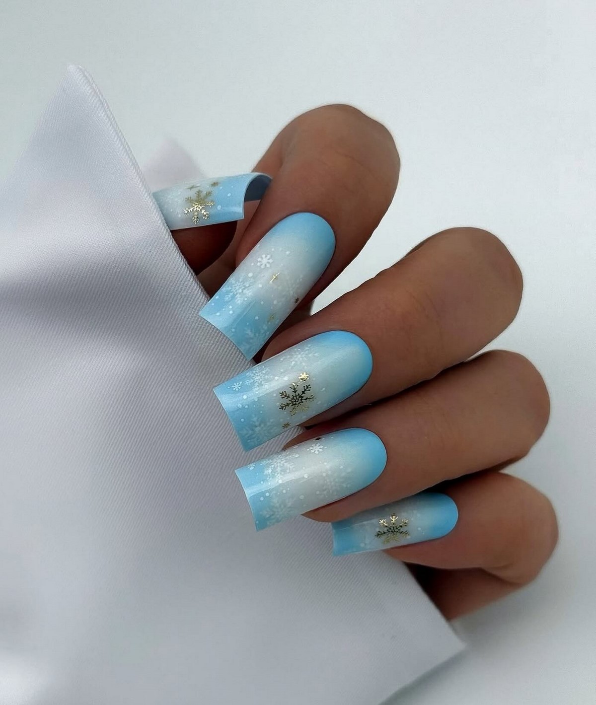 Градієнтний зимовий манікюр зі сніжинками — це плавний перехід відтінків, який створює ефект м’якого неба або засніженого горизонту. Найбільш популярні переходи білого в блакитний, молочного в сріблястий або синього в темно-фіолетовий.