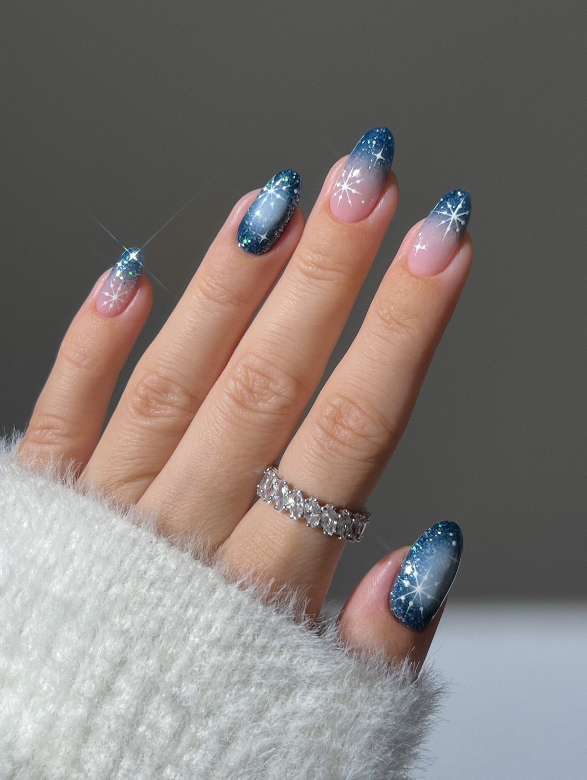Градієнт відмінно підходить для акцентного манікюру — достатньо виділити один-два нігті сніжинками, щоб отримати стильний і сучасний образ.